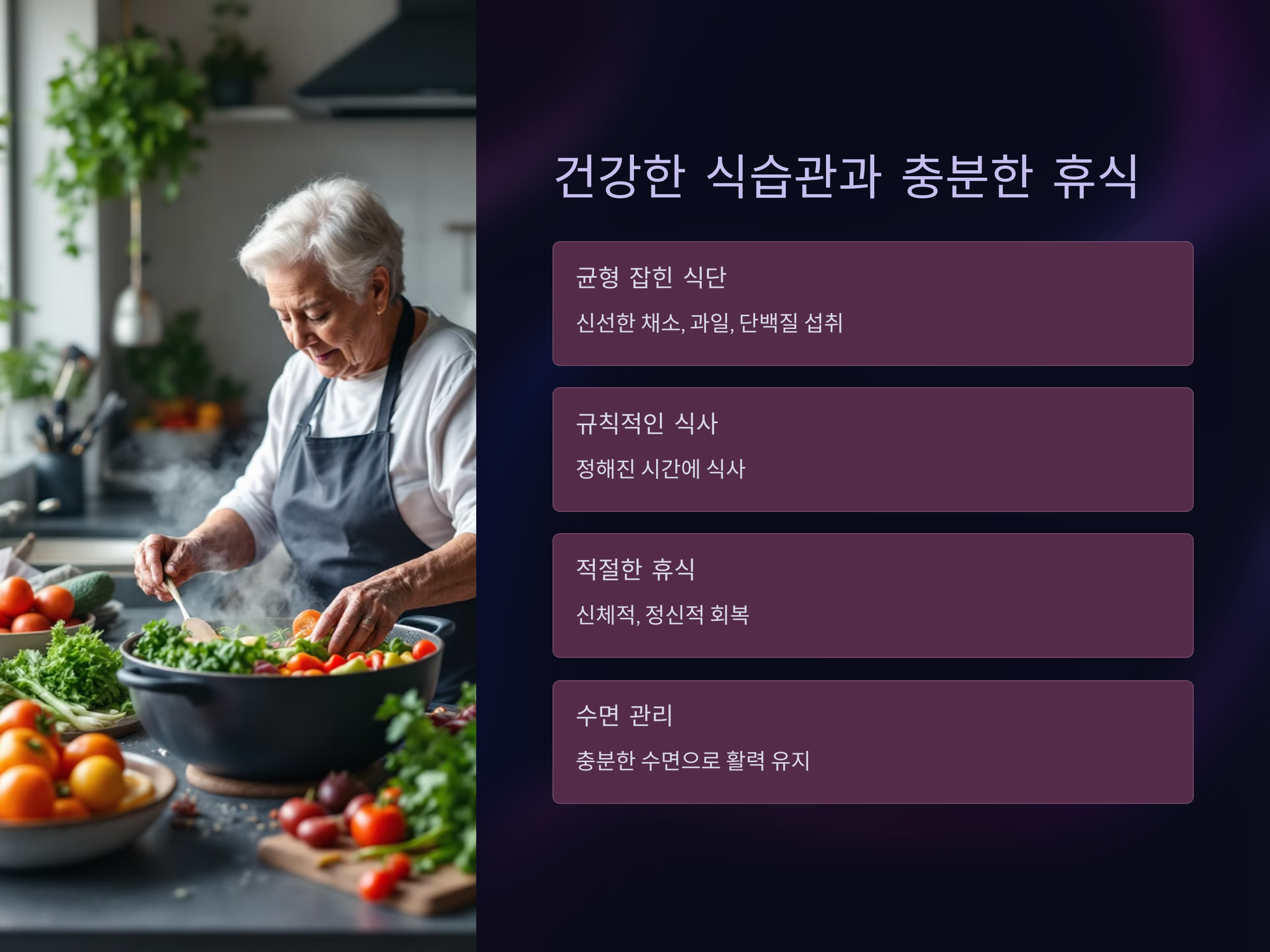 마지막으로, 퇴직 후에도 활기차게 생활하는 사람들은 건강한 식습관을 유지합니다. 이는 단기적으로는 몸의 피로를 덜어주고, 장기적으로는 나이가 들수록 건강을 유지하는 데 중요한 역할을 합니다. 신선한 채소와 과일, 단백질을 충분히 섭취하며, 정해진 시간에 규칙적으로 식사를 하는 것이 좋습니다.