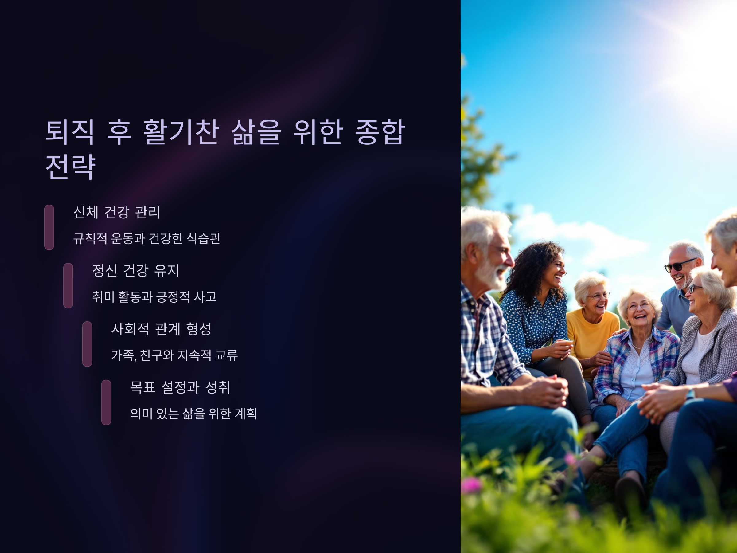또한, 퇴직 후에는 명확한 목표를 세우는 것이 중요합니다. 퇴직 후의 목표는 단순히 돈을 버는 것이 아닌, 더 의미 있는 삶을 살아가는 것입니다. 그 목표가 자원봉사나 여행, 글쓰기, 새로운 사업을 시작하는 것일 수 있습니다. 자신의 목표를 가지고 꾸준히 노력하는 사람들은 퇴직 후에도 삶에 활력을 느끼며 살아갑니다.