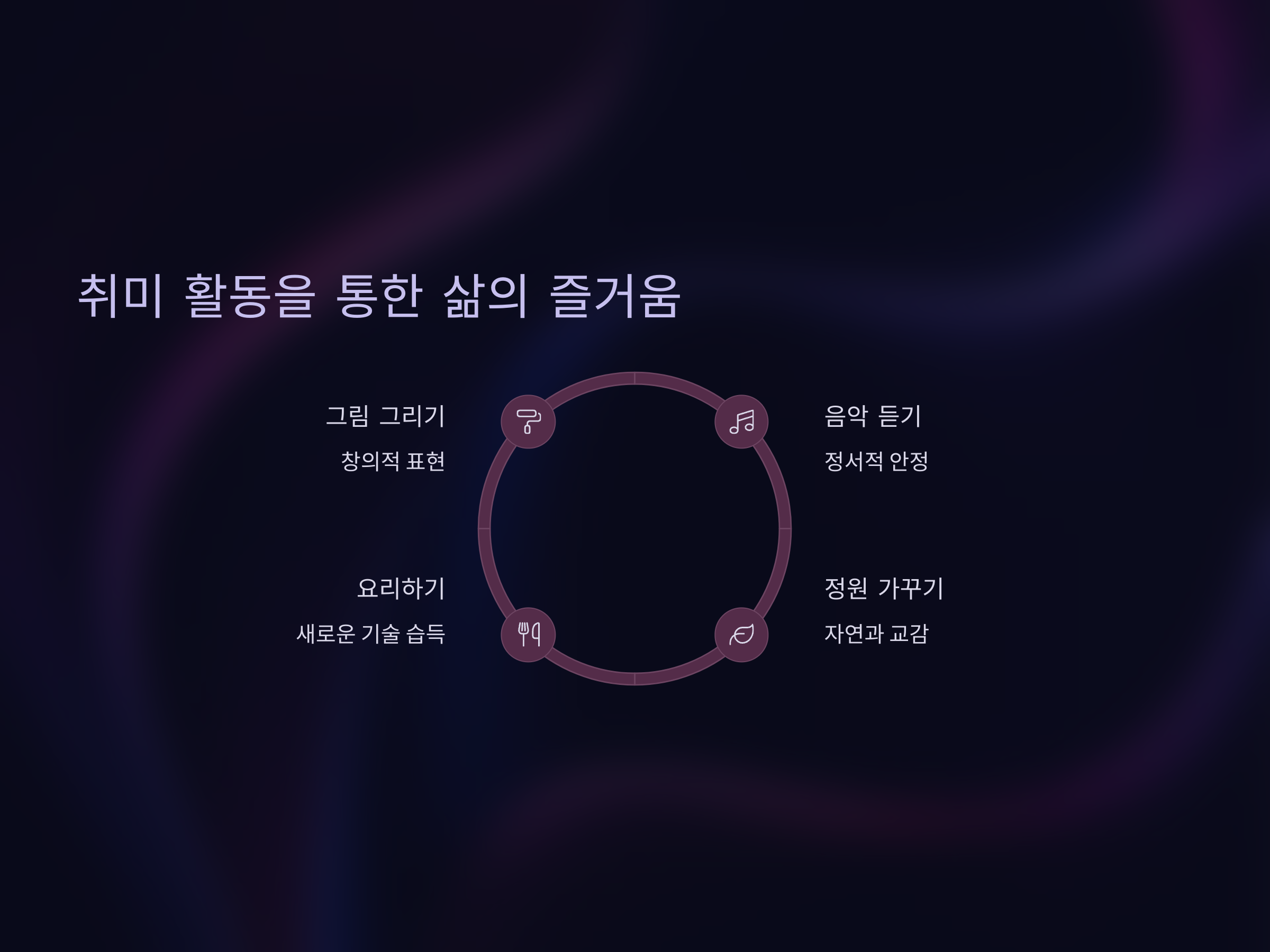 취미 활동을 통해 새로운 기술을 배우거나, 자신만의 세계를 만들어가면서 자아를 발전시킬 수 있습니다. 또한, 취미가 다른 사람들과의 사회적 교류를 만들어낼 수 있는 기회를 제공하기도 합니다. 특히, 지역 모임이나 온라인 커뮤니티에서 새로운 사람들과 만나며 즐거운 시간을 보내는 것이 큰 도움이 됩니다.