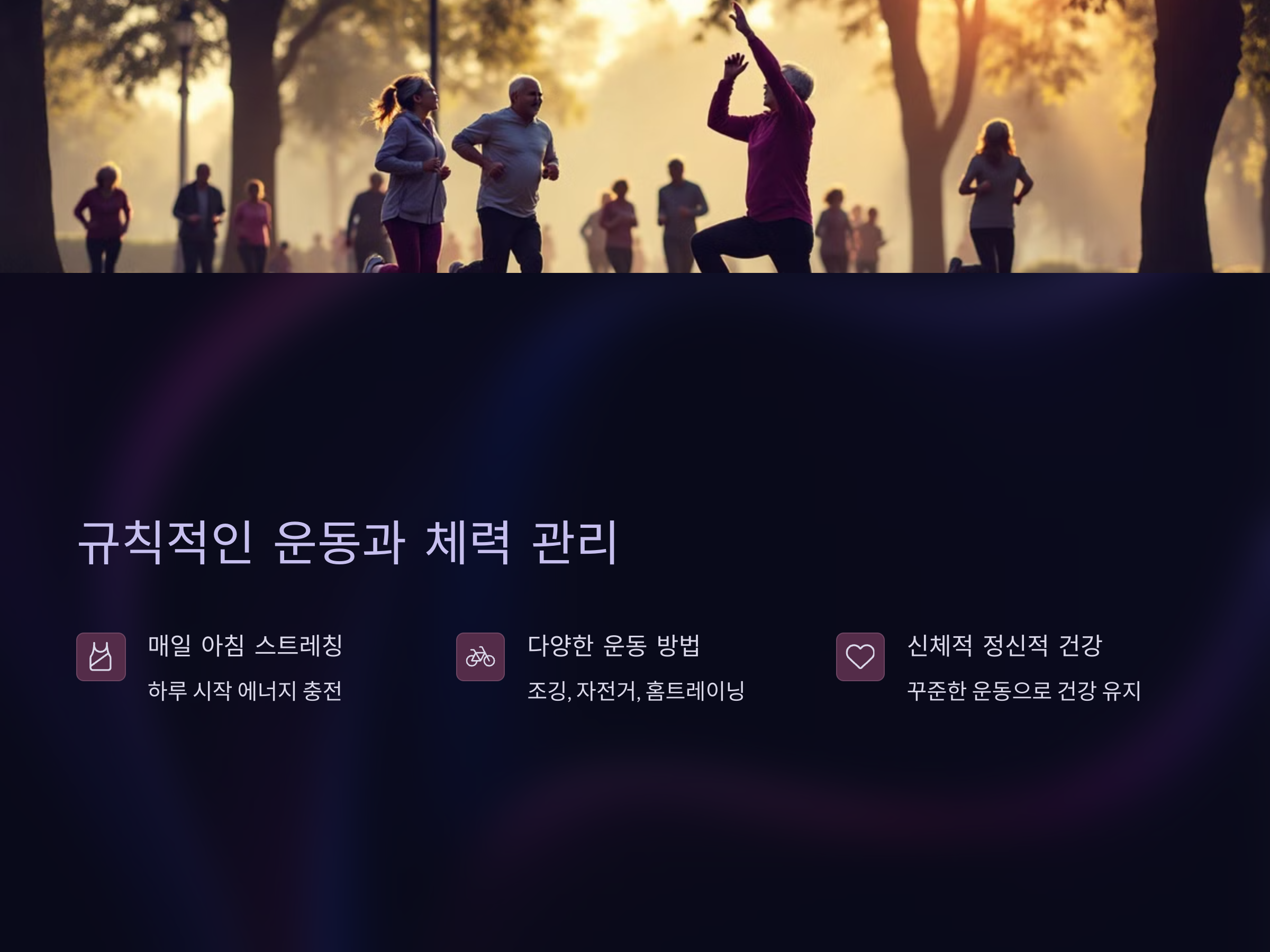 퇴직 후에도 활기차게 생활하는 사람들은 대부분 규칙적으로 운동을 합니다. 이는 신체적인 건강뿐만 아니라 정신적인 건강에도 큰 영향을 미칩니다. 주기적인 운동은 기분을 좋게 하고, 에너지를 충전하는 데 도움을 줍니다. 특히, 매일 아침 간단한 스트레칭이나 산책을 하는 것만으로도 하루를 시작하는 에너지를 얻을 수 있습니다. 운동을 통해 퇴직 후에도 활발하게 움직일 수 있는 신체 조건을 유지하는 것이 중요합니다.
