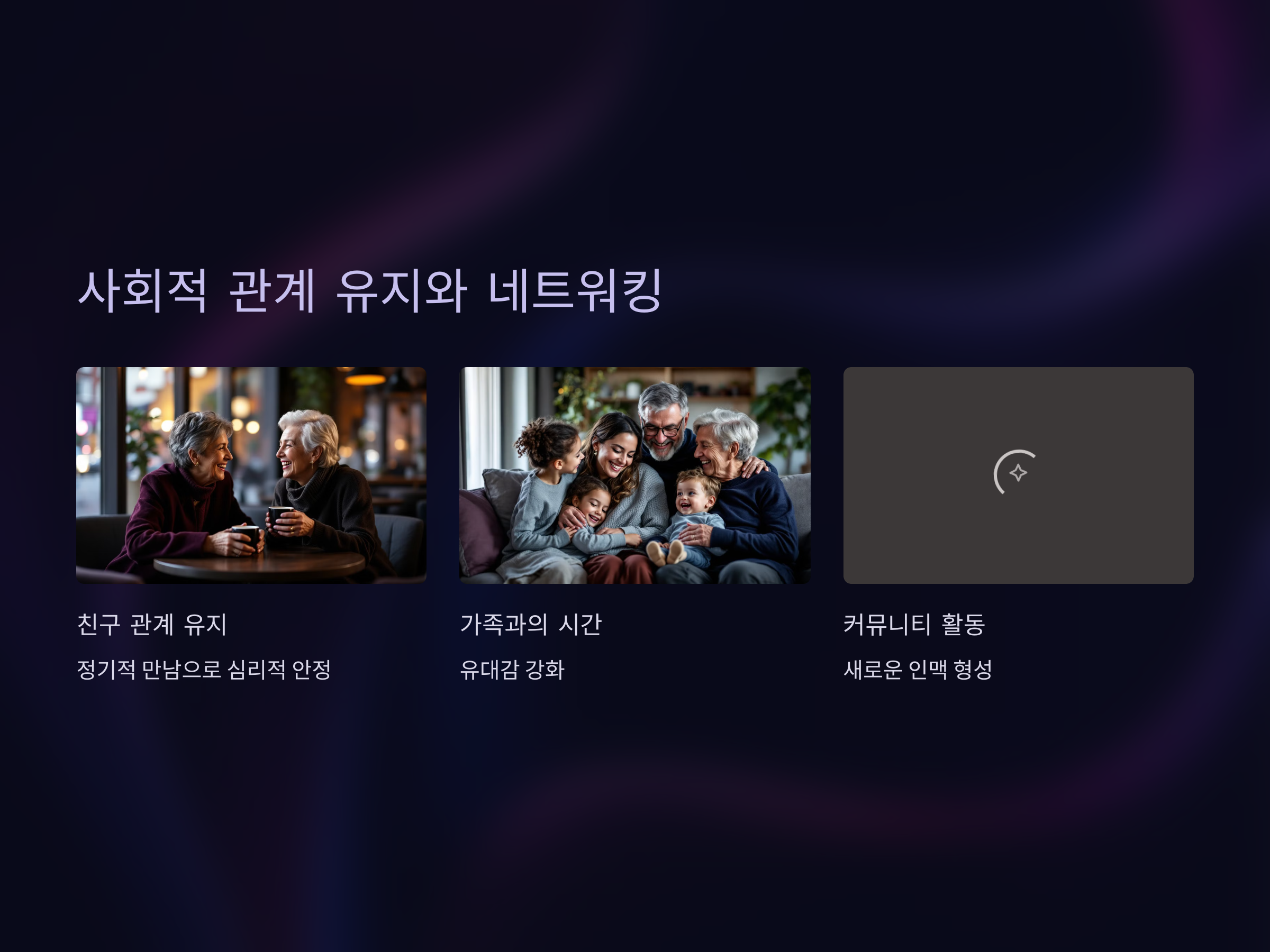 여기서 중요한 점은 사람들과의 교류가 일방적이지 않다는 것입니다. 퇴직 후에는 자주 만나는 사람들과의 관계에서 상호 소통을 강화하며, 새로운 인맥을 쌓는 것이 중요합니다. 다양한 사회적 활동을 통해 사람들과 교류하고, 사회적 네트워크를 확장하면 그만큼 삶의 활력도 더해집니다.