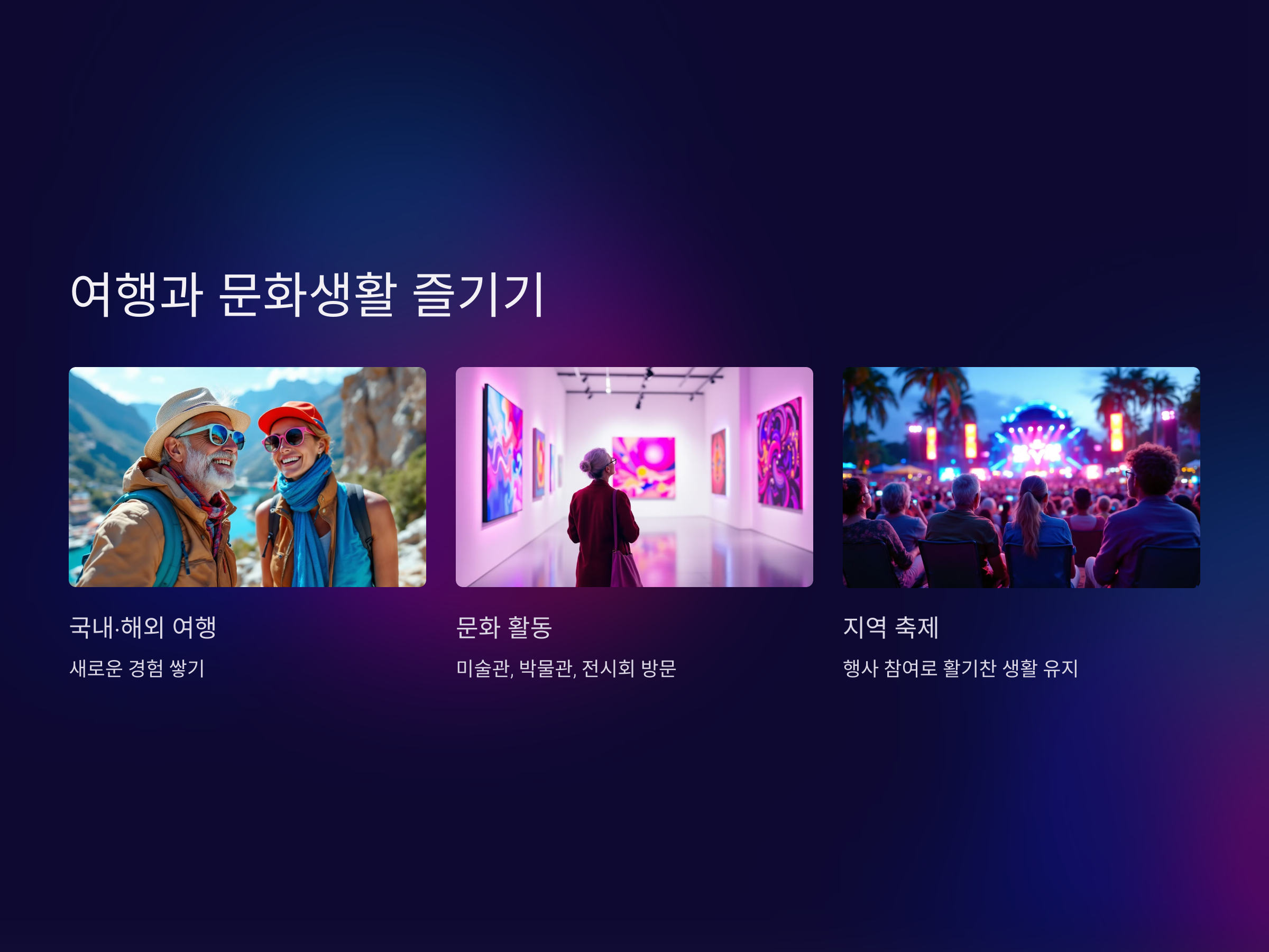 퇴직 후 여유로운 시간을 활용하여 여행을 다니거나 문화생활을 즐기는 것도 좋은 방법입니다. 특히, 요즘은 혼자서도 쉽게 여행을 다닐 수 있는 프로그램이 많아졌고, 공연·전시·영화 관람 등 다양한 문화 활동도 즐길 수 있습니다.