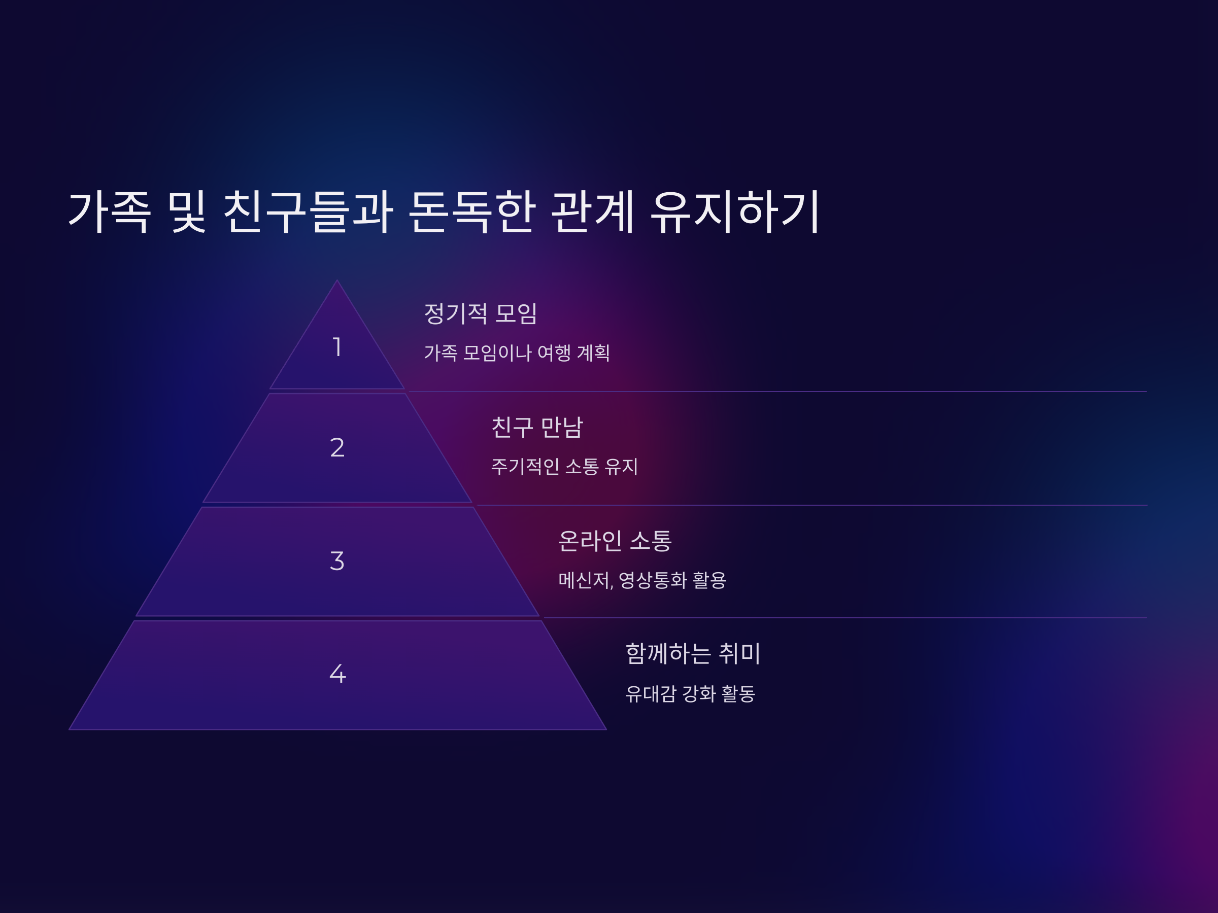 사회생활을 즐기는 것 못지않게 중요한 것이 가족 및 친구들과의 관계를 돈독히 유지하는 것입니다. 아무리 바쁜 생활을 하더라도 가족과 시간을 보내고, 친구들과 정기적으로 만나 소통하는 것이 필요합니다.