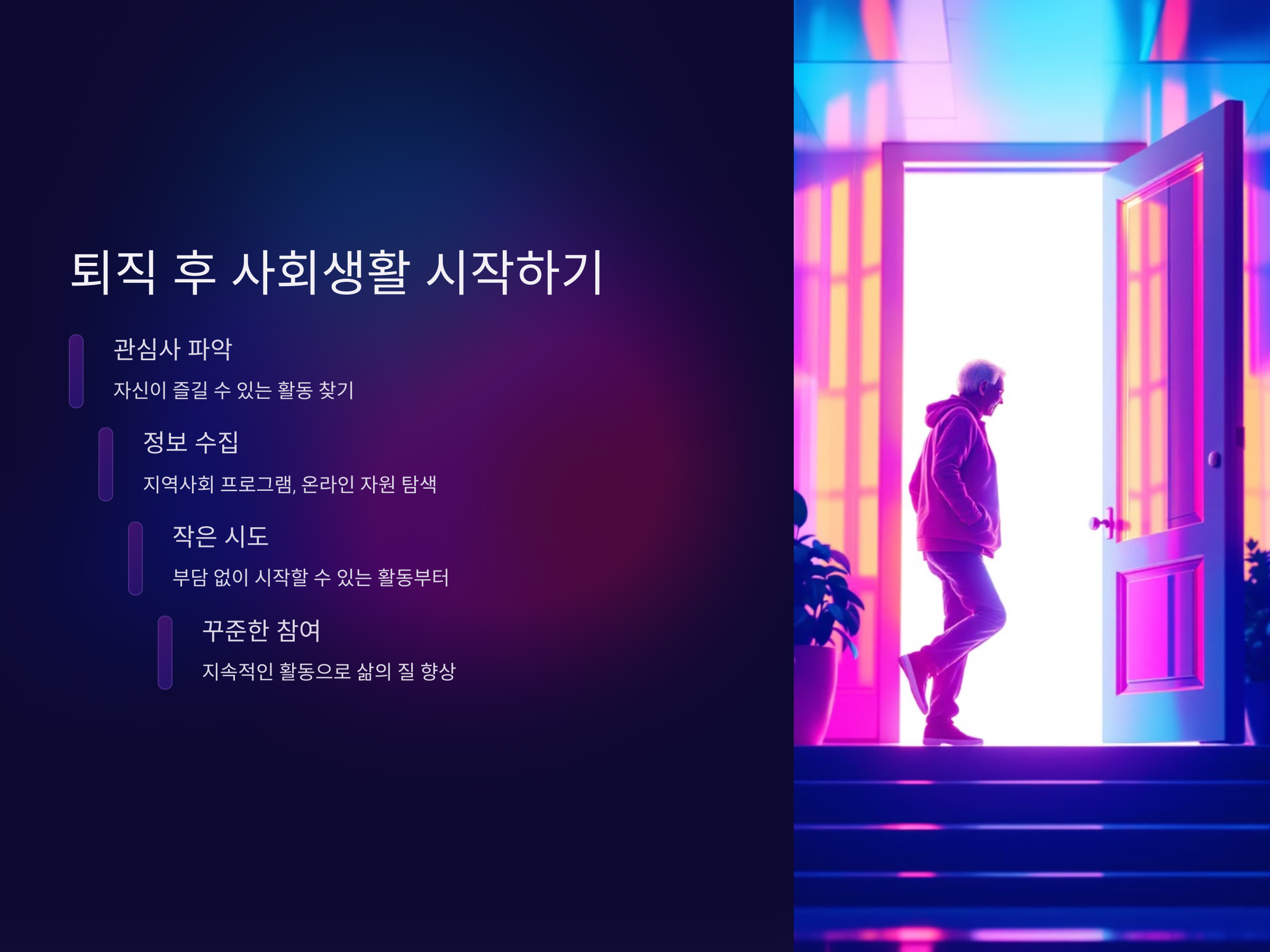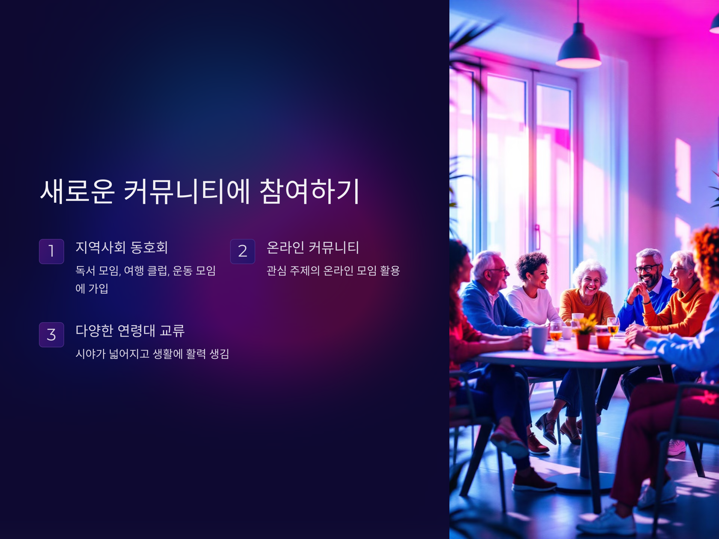 퇴직 후에도 활발한 사회생활을 위해서는 새로운 사람들과 어울릴 수 있는 커뮤니티에 참여하는 것이 중요합니다. 지역사회에서 운영하는 동호회, 독서 모임, 여행 클럽, 운동 모임 등에 가입하면 자연스럽게 새로운 친구를 사귈 수 있습니다. 특히, 요즘은 온라인 커뮤니티도 활성화되어 있어 관심 있는 주제의 온라인 모임에 가입하는 것도 좋은 방법입니다.