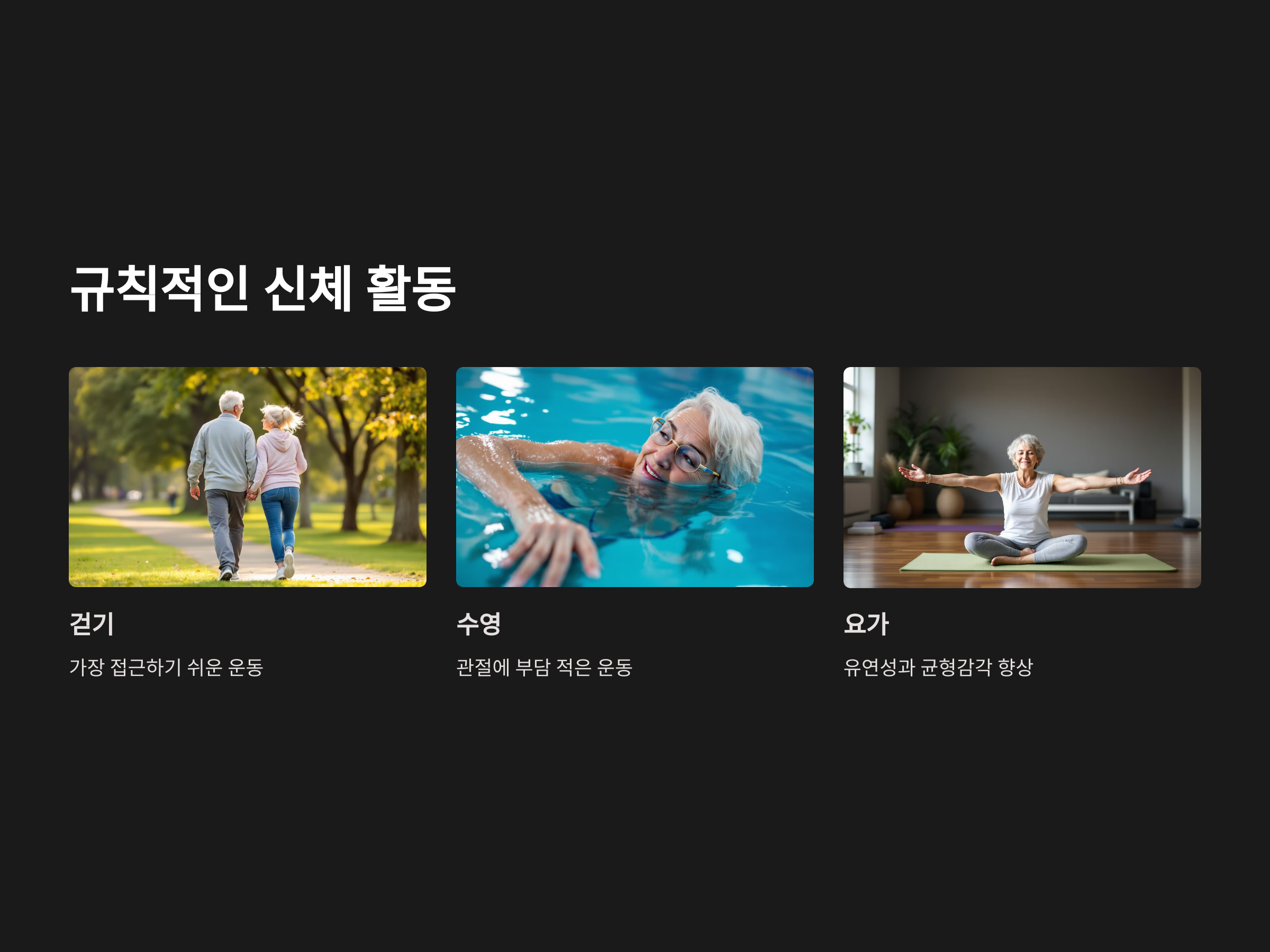 신체적 건강은 활기찬 삶의 기본입니다. 퇴직 후에도 꾸준한 운동 습관을 유지하는 사람들은 에너지가 넘치며, 다양한 활동에 참여할 수 있는 체력을 갖추게 됩니다. 걷기, 수영, 요가 등 자신의 취향에 맞는 운동을 선택하여 규칙적으로 실천하는 것이 중요합니다.