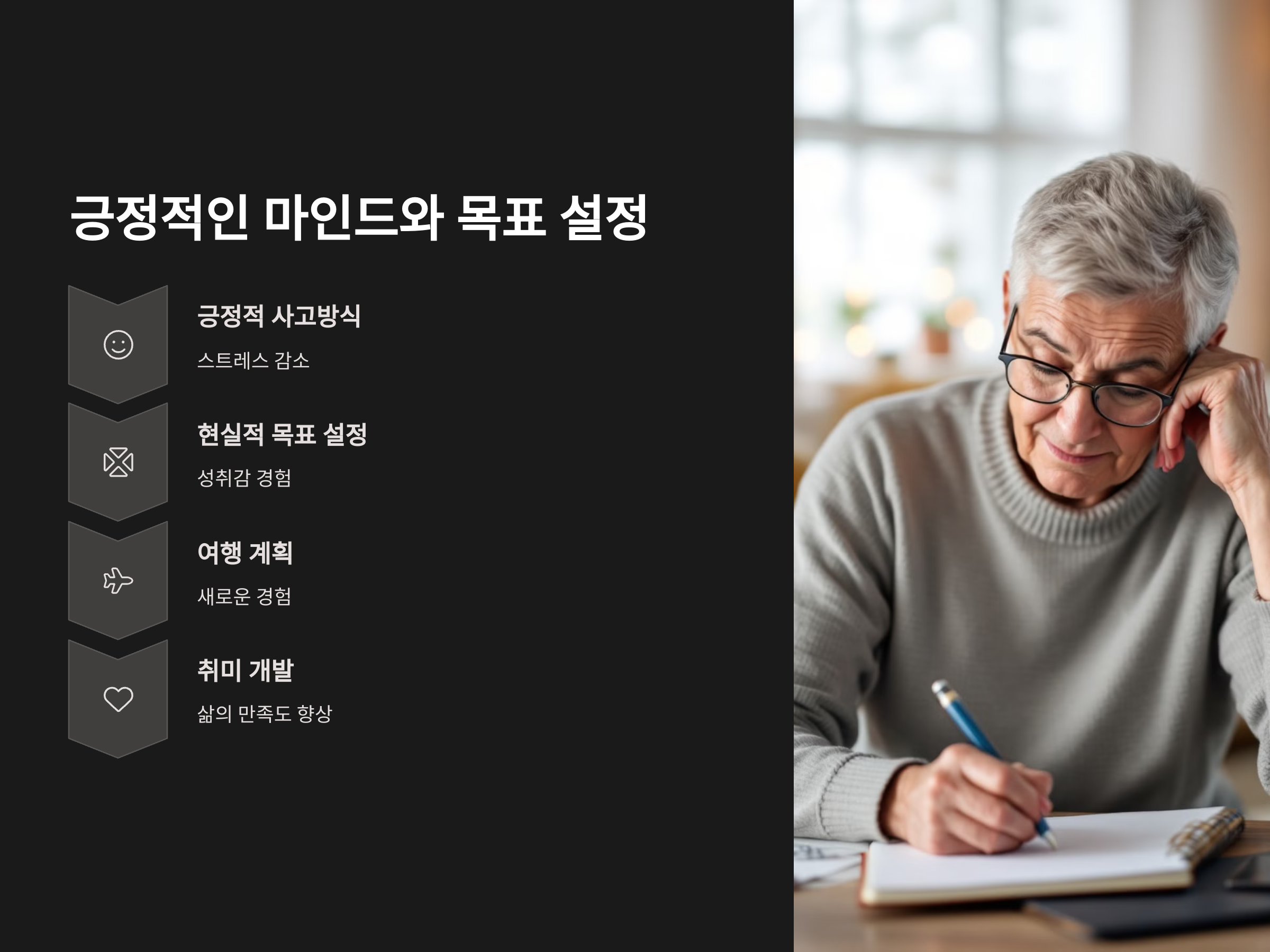적극적인 은퇴자들은 긍정적인 사고방식을 유지하며, 현실적인 목표를 설정하고 이를 달성하기 위해 노력합니다. 이러한 목표는 여행, 봉사활동, 취미 개발 등 다양할 수 있으며, 목표를 향한 노력은 삶의 의미와 만족도를 높여줍니다.
