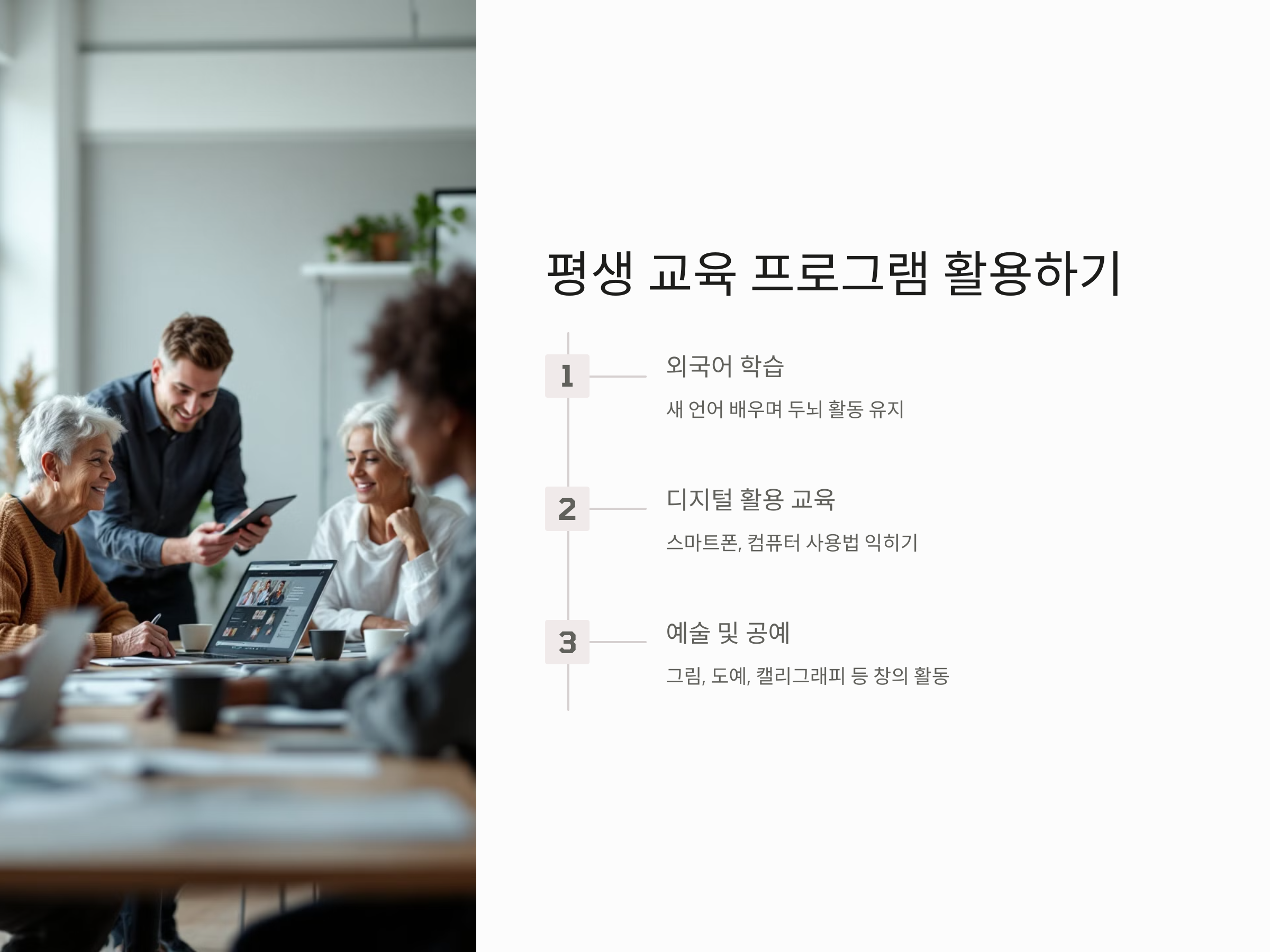퇴직 후에도 배우는 즐거움을 누리는 것은 삶의 질을 높이는 데 중요한 요소입니다. 대학 평생교육원, 주민자치센터, 온라인 강의 플랫폼 등에서 다양한 교육 프로그램을 제공하고 있습니다.
