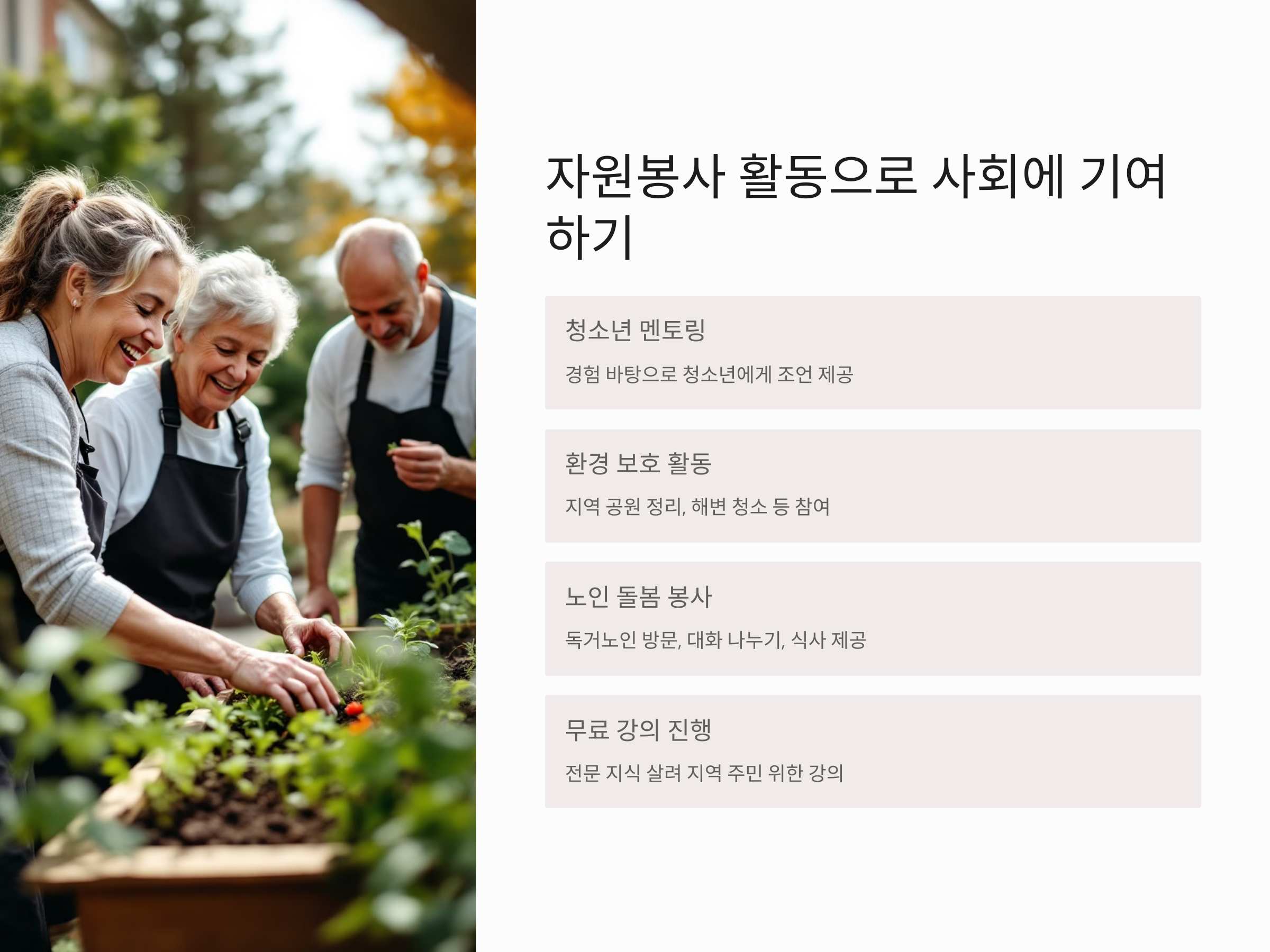- 노인 돌봄 봉사: 독거노인들을 방문해 대화를 나누거나 식사를 제공하는 등의 활동이 포함됩니다.