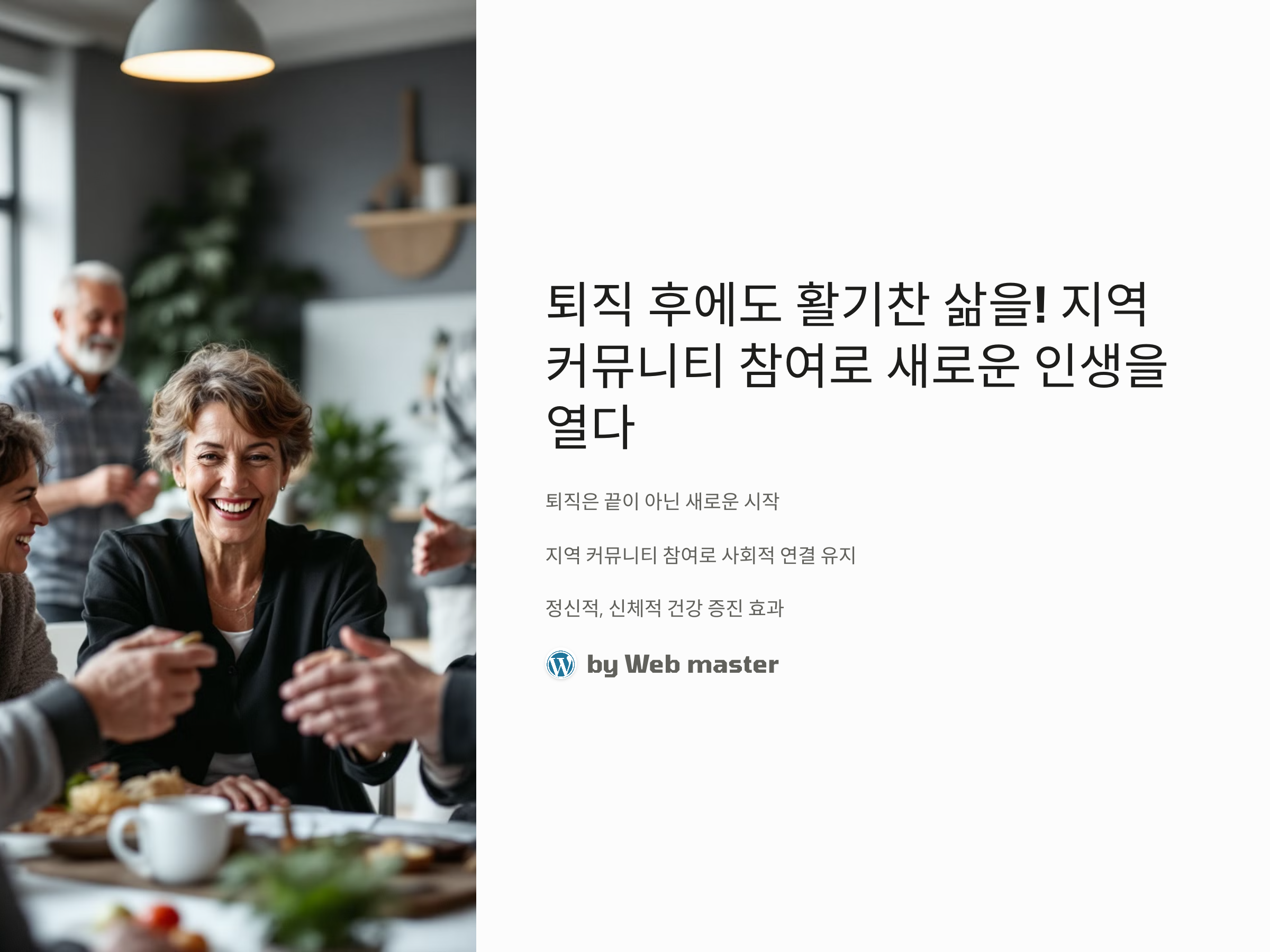 퇴직 후에도 활기찬 삶을 위해 지역 커뮤니티에 참여해보세요. 새로운 사람들과 소통하고 의미 있는 활동을 하면서 더 행복한 제2의 인생을 시작할 수 있습니다.