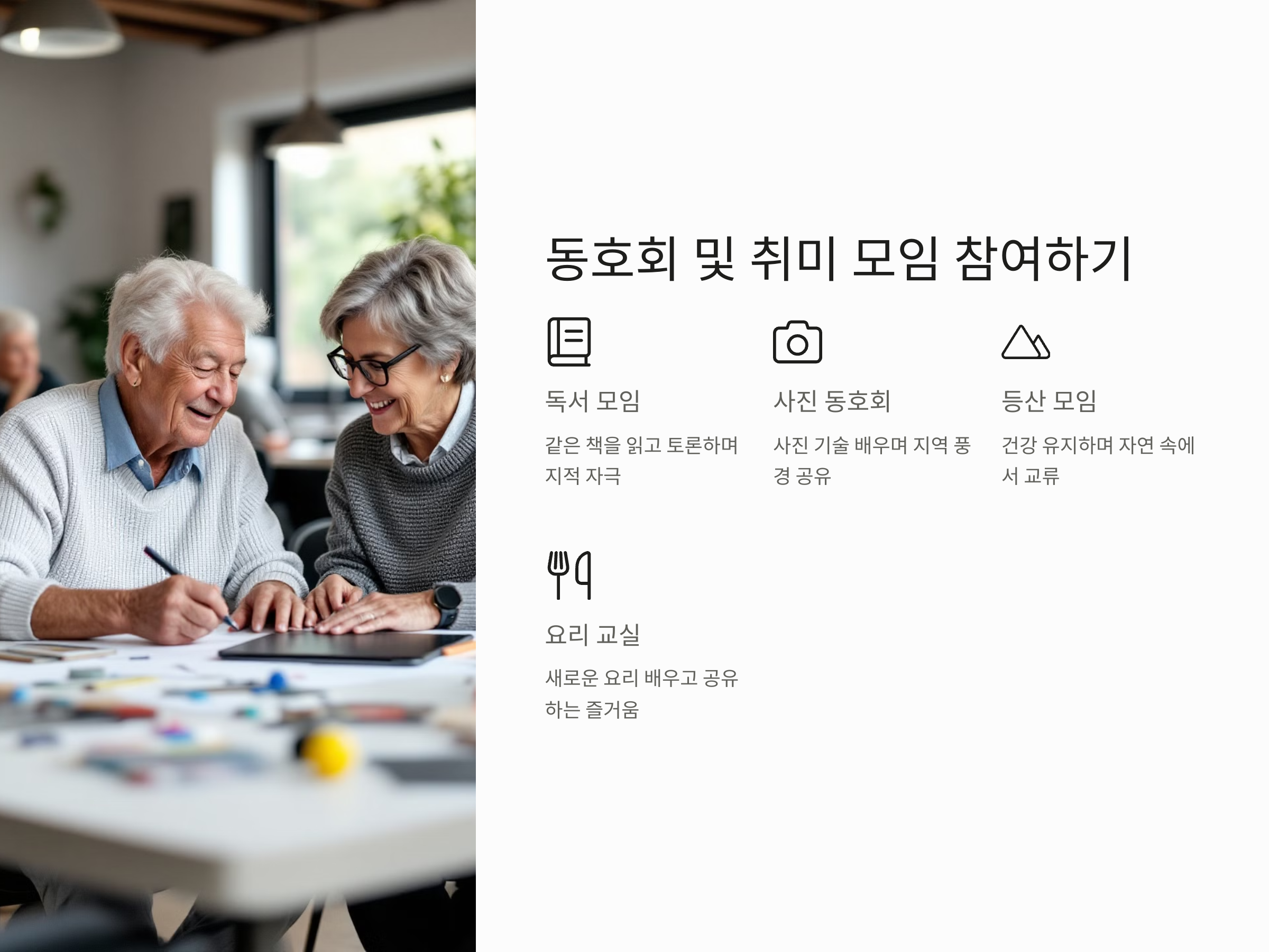 - 독서 모임: 같은 책을 읽고 토론하는 활동으로 지적 자극을 받을 수 있습니다.
