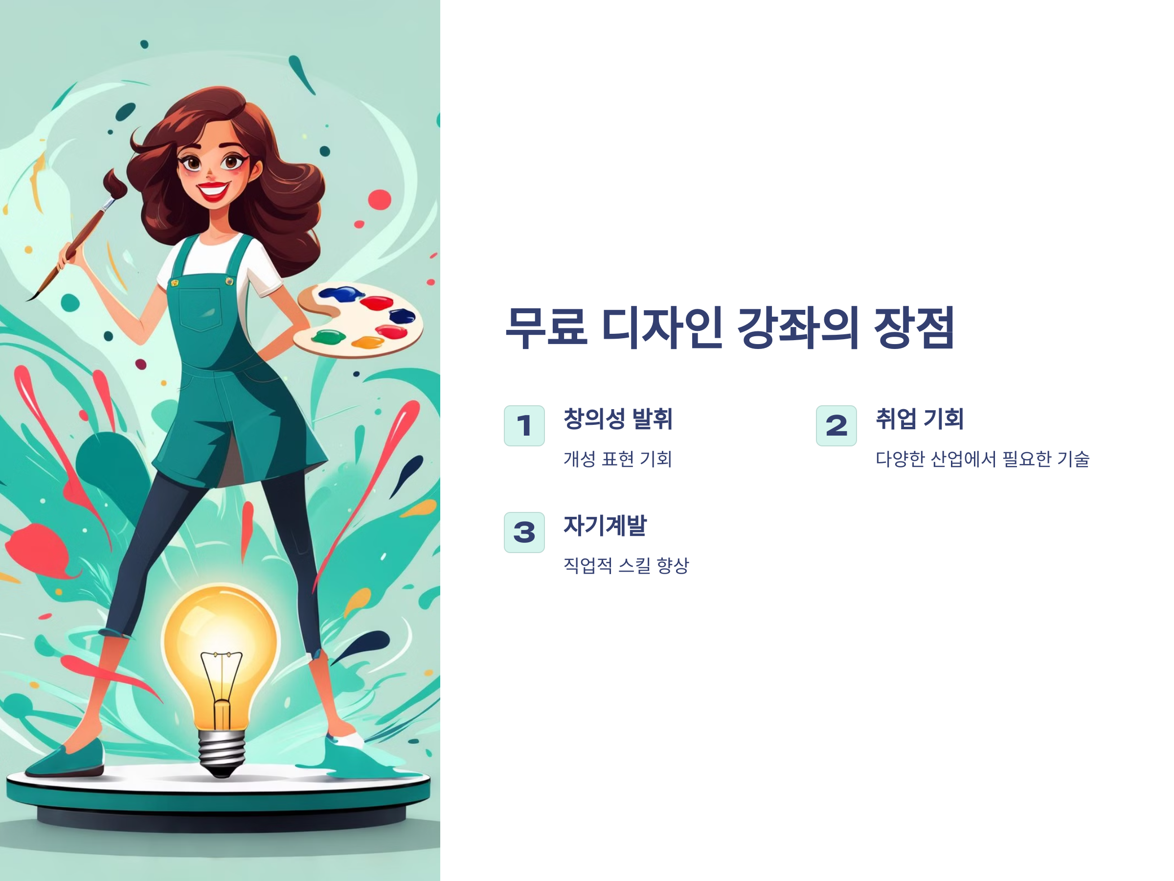 - 취업 기회: 디자인은 매우 다양한 산업에서 필요로 하는 기술로, 디지털 디자인, 그래픽 디자인, UI/UX 디자인 등 다양한 분야에서 일자리를 찾을 수 있습니다.