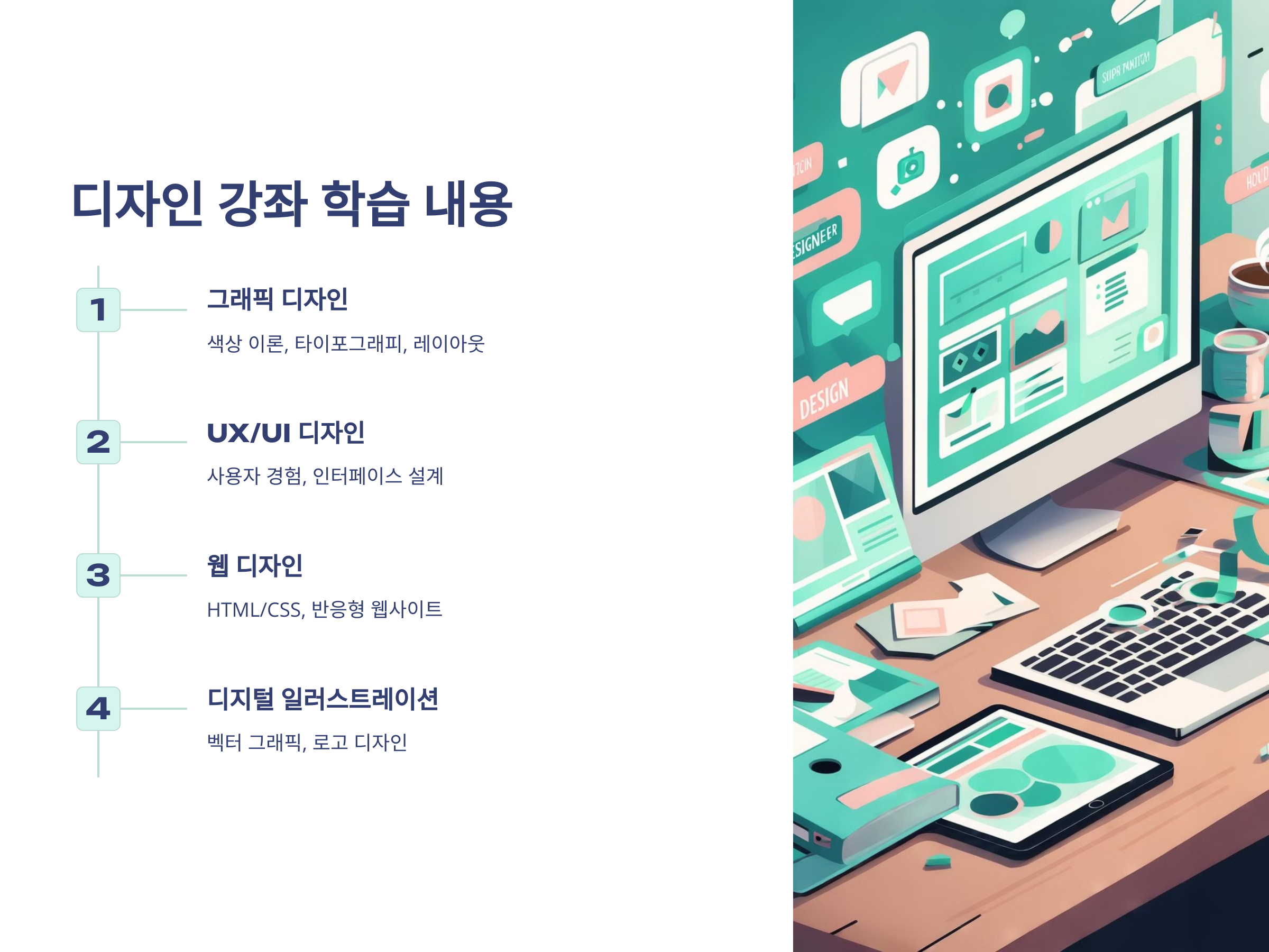 - 학습 내용: 디자인 소프트웨어 사용법, 기본적인 디자인 원리, 다양한 디자인 스타일 이해
