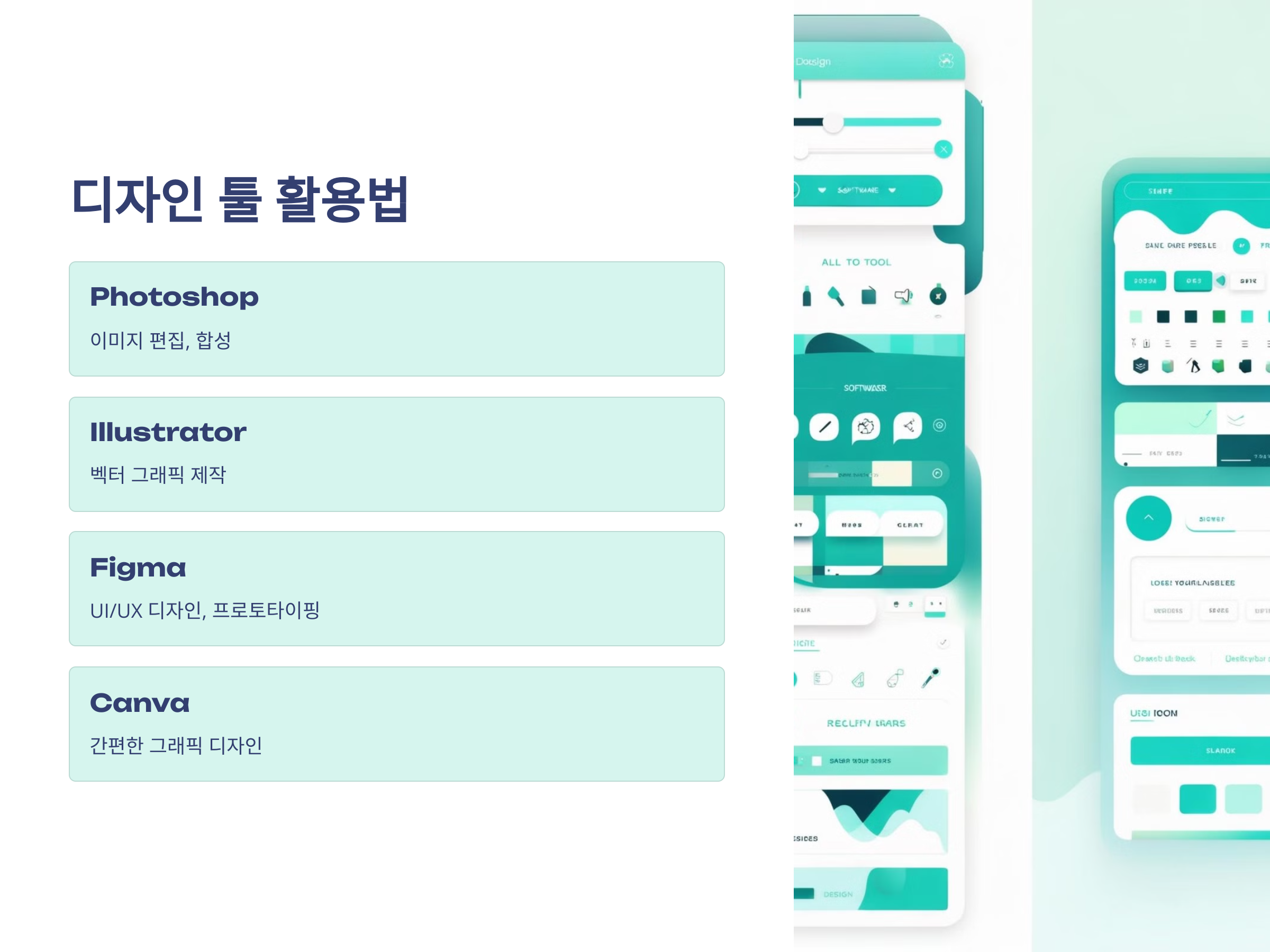 디자인 툴을 잘 활용하는 것은 디자인의 퀄리티를 높이는 데 중요합니다. Photoshop과 Illustrator는 디자인에서 가장 많이 사용하는 툴로, 이미지 편집, 그래픽 디자인, 일러스트레이션을 만들 수 있는 능력을 배울 수 있습니다.