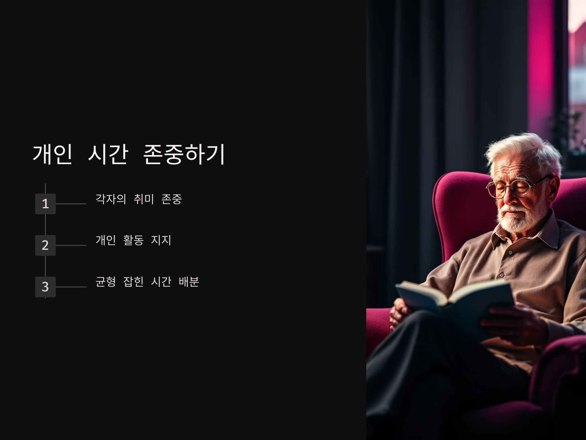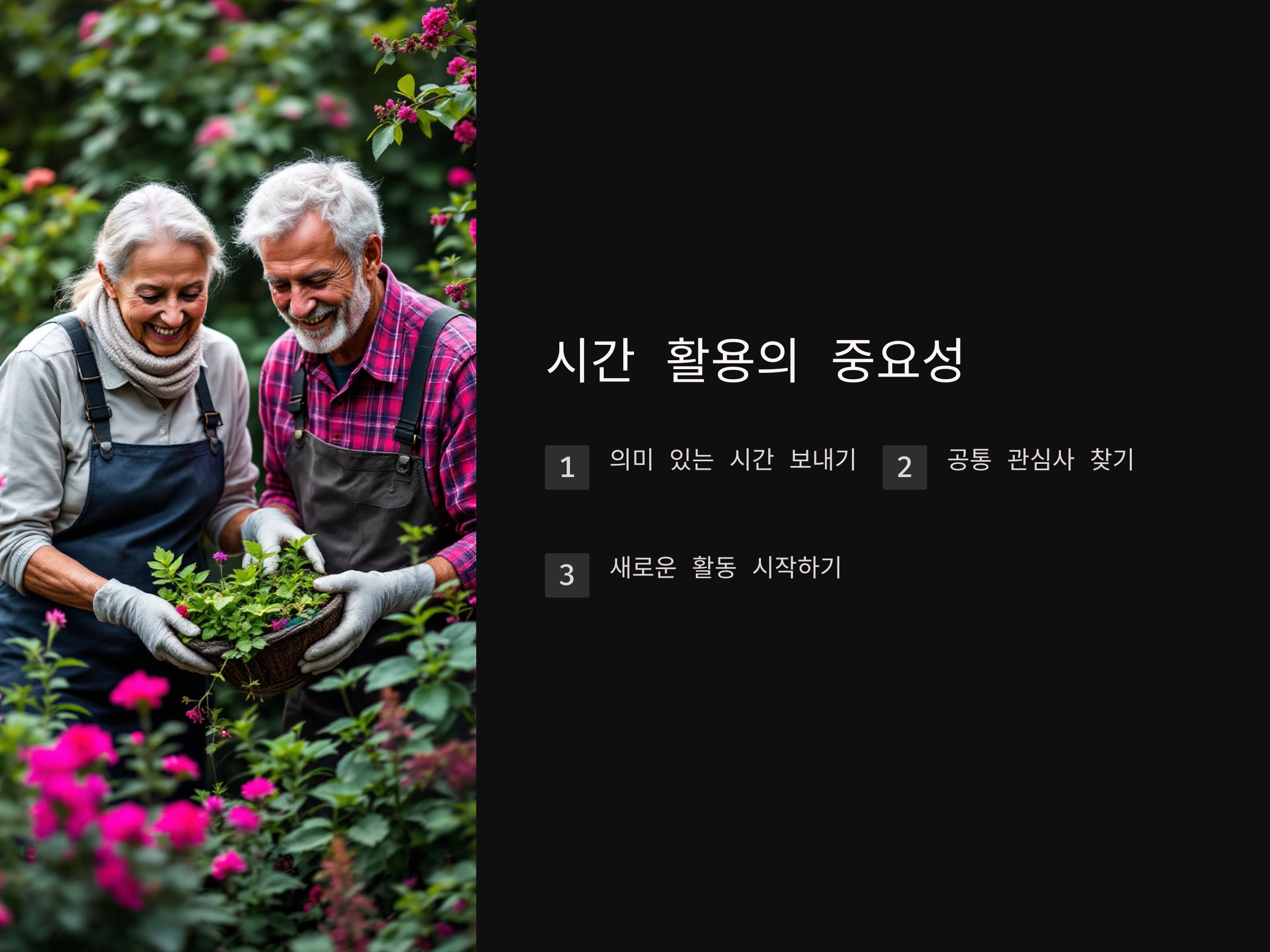 퇴직 후 가장 중요한 것은 '시간'입니다. 직장에서 보내던 많은 시간을 가족과 함께 보내게 되는데, 이 시간을 어떻게 보낼지에 대한 계획이 필요합니다. 대부분의 사람들이 퇴직 후 첫 번째로 마주하는 도전은 '시간을 어떻게 활용할 것인가?'입니다.