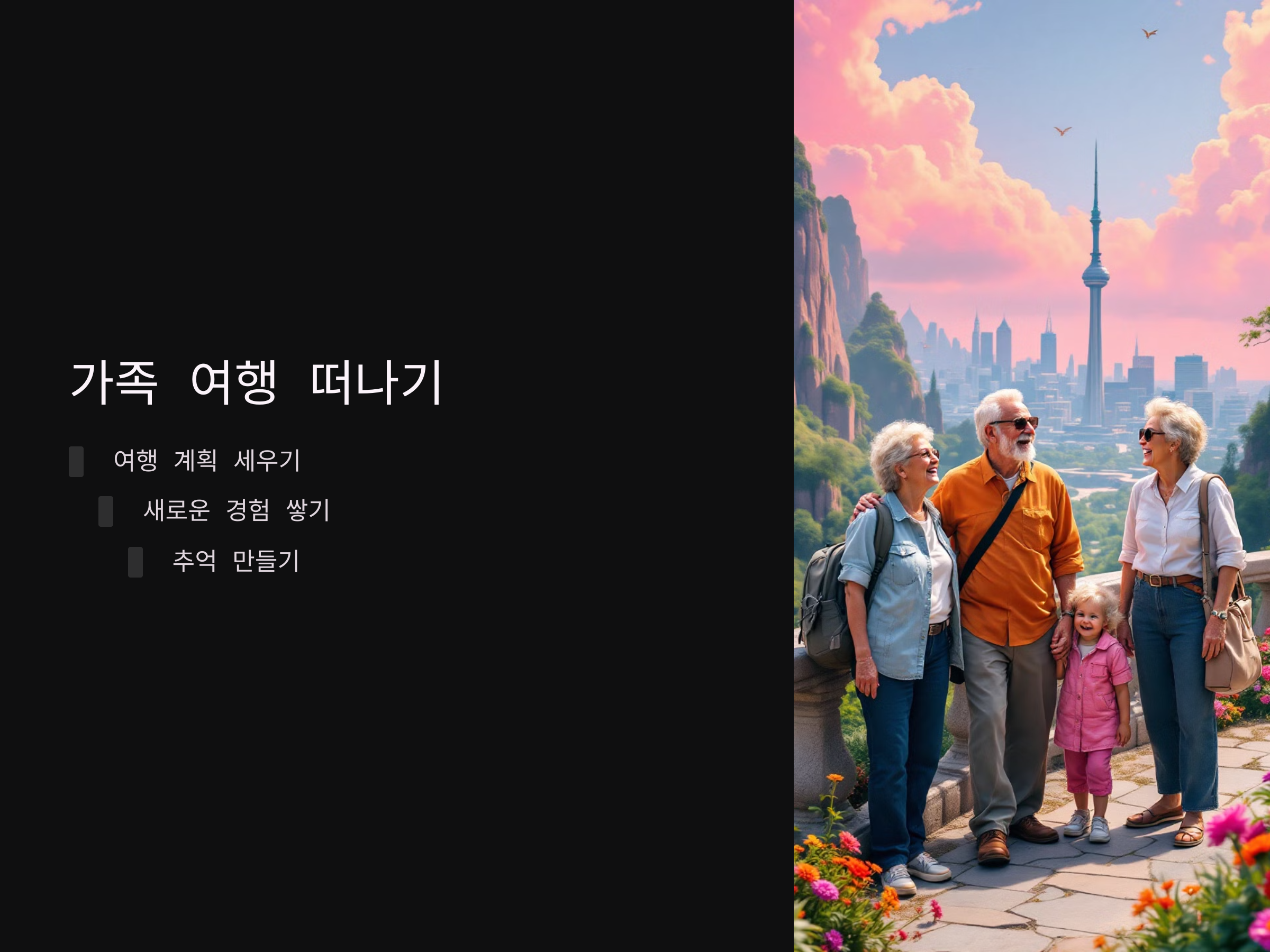 단, 여행을 계획할 때는 가족 구성원 모두의 취향을 고려해야 합니다. 어떤 여행이 모두에게 즐거운지 고민하고, 함께하는 시간을 즐기는 것이 핵심입니다. 여행 중에는 서로의 관심사와 취향을 존중하며 새로운 경험을 만들어 가세요.