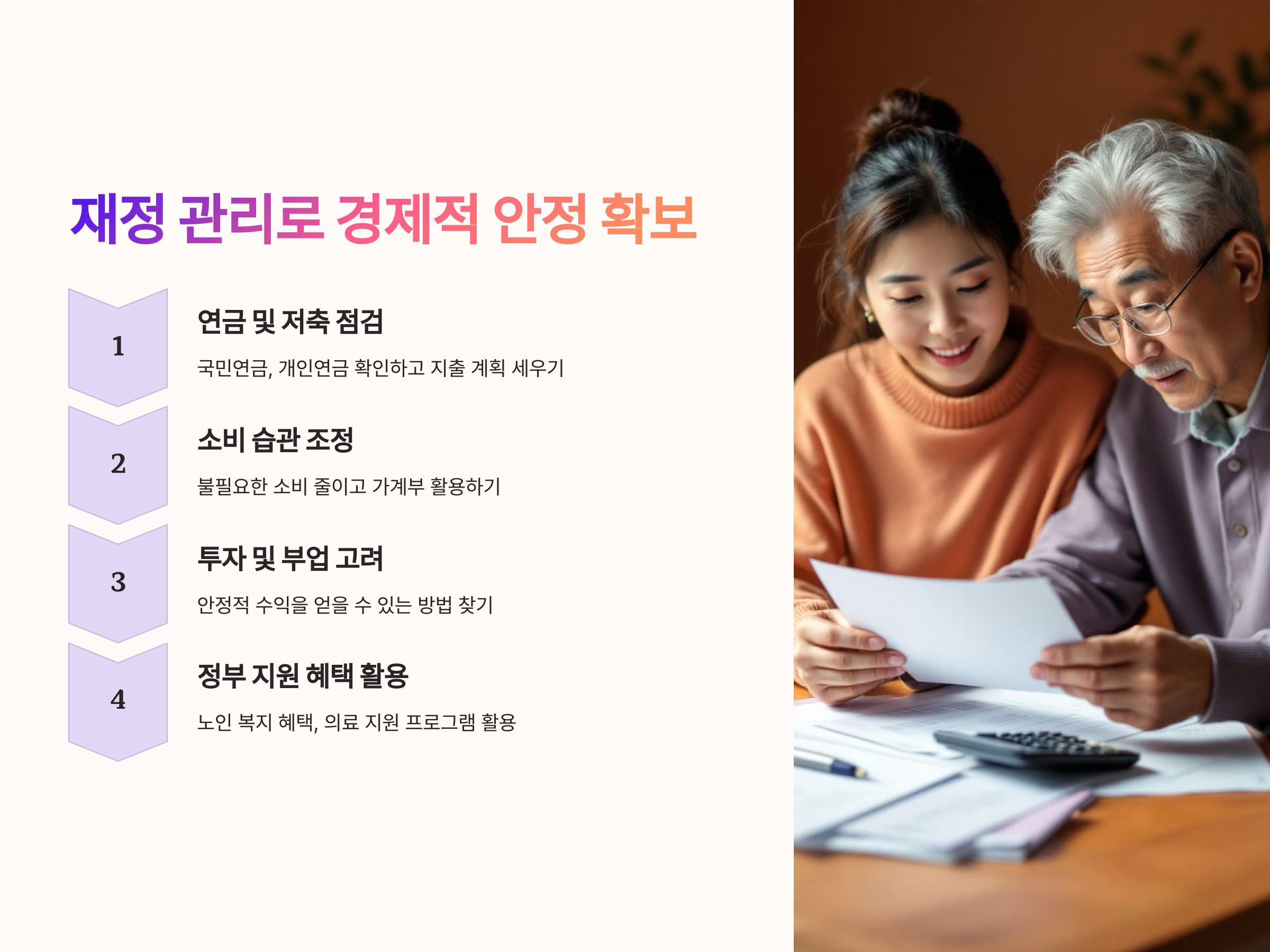 - 정부 지원 혜택 활용: 노인 복지 혜택이나 의료 지원 프로그램을 적극 활용하세요.