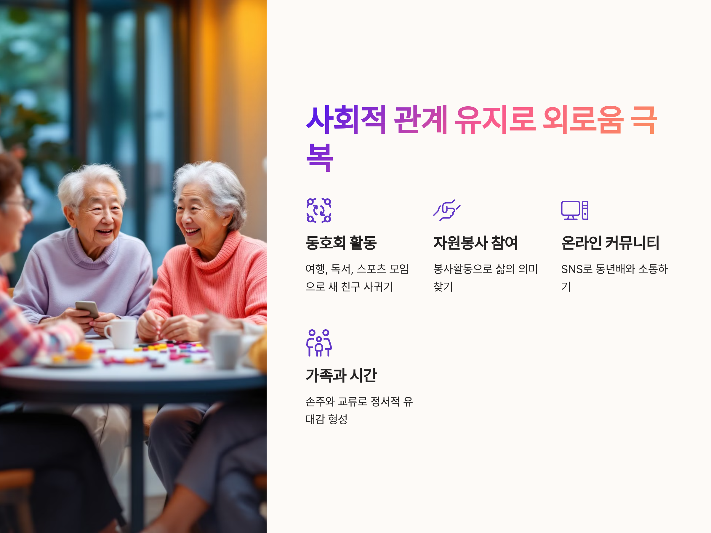 퇴직 후 가장 큰 변화 중 하나는 직장 동료들과의 관계가 단절된다는 점입니다. 이는 우울증, 외로움, 인지 기능 저하로 이어질 수 있습니다. 따라서 사회적 활동을 적극적으로 유지하는 것이 중요합니다.