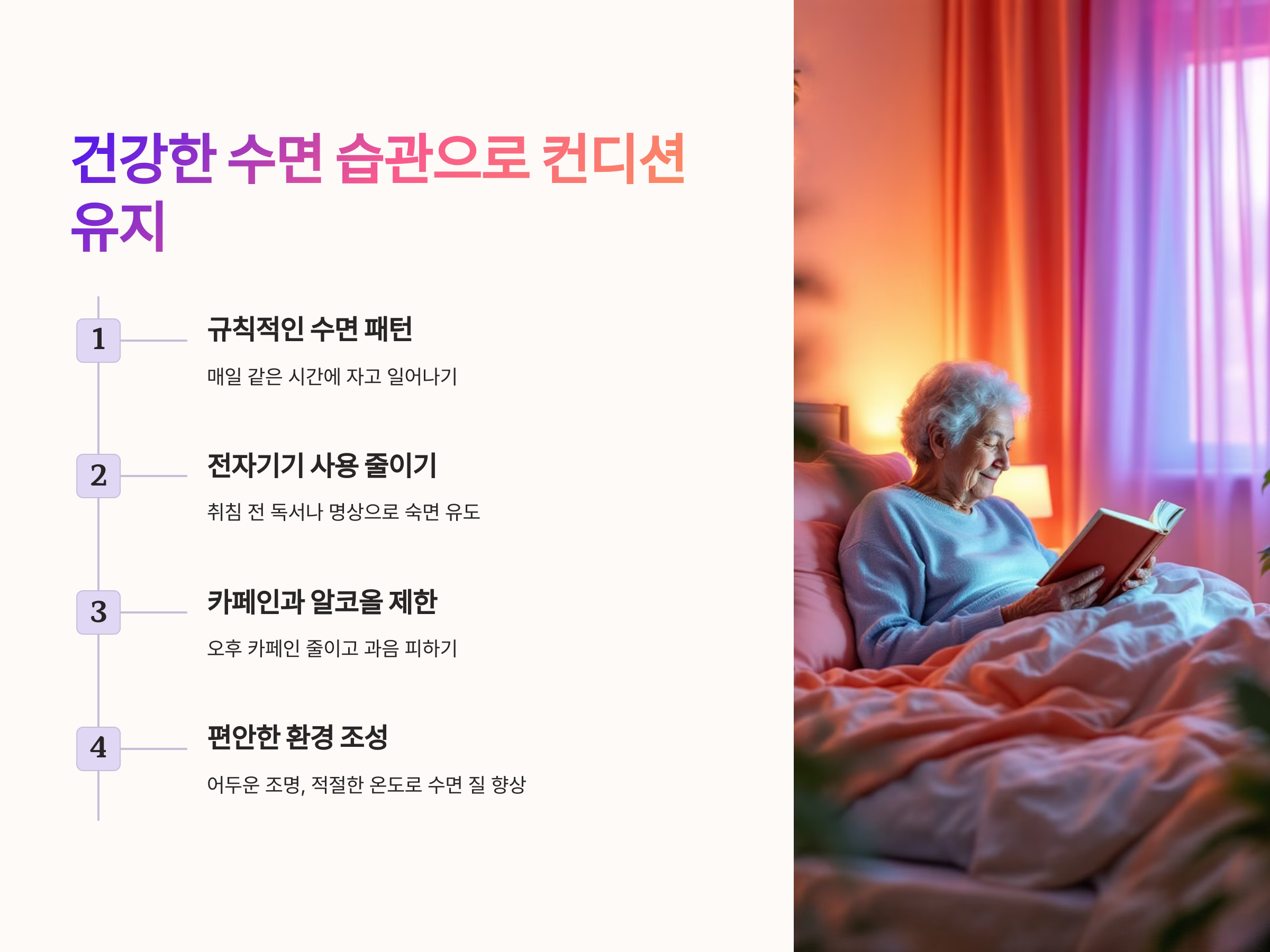 - 규칙적인 수면 패턴 유지: 매일 같은 시간에 자고 일어나는 것이 중요합니다.