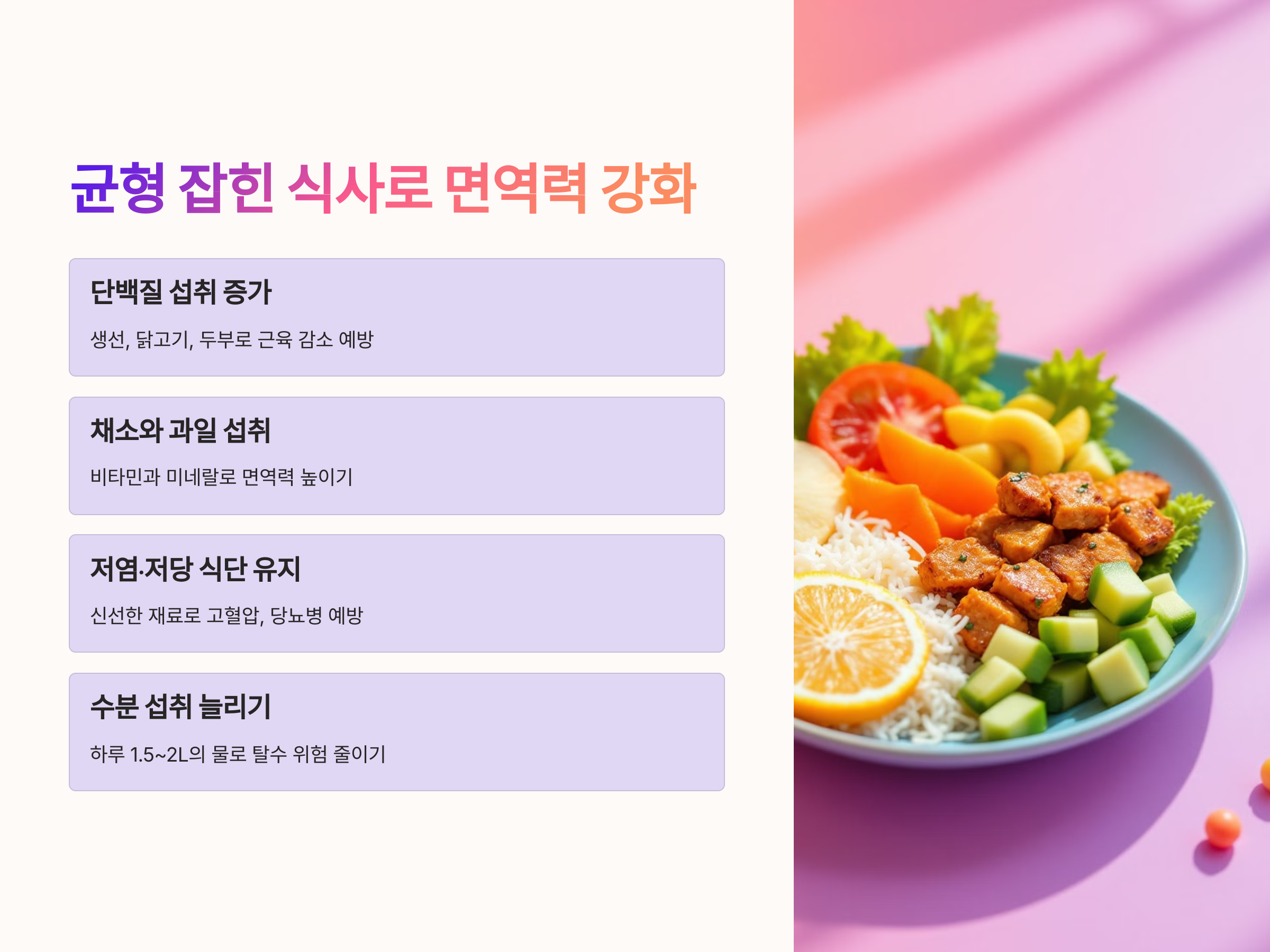 - 단백질 섭취 증가: 근육 감소를 예방하기 위해 생선, 닭고기, 두부, 콩 등 단백질이 풍부한 음식을 섭취해야 합니다.