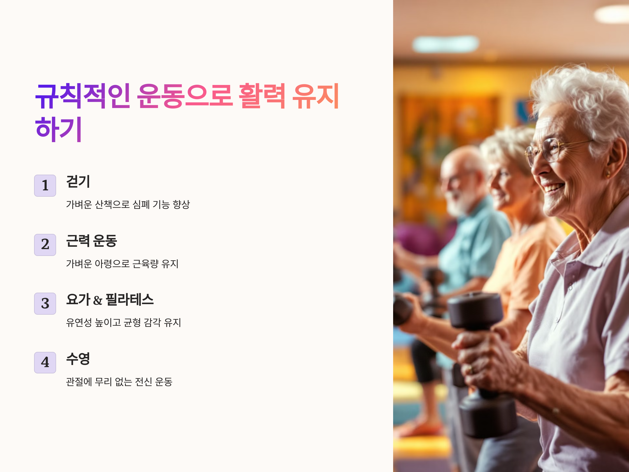 - 근력 운동: 나이가 들수록 근육량이 줄어들므로 가벼운 아령 운동이나 스트레칭을 통해 근력을 유지해야 합니다.