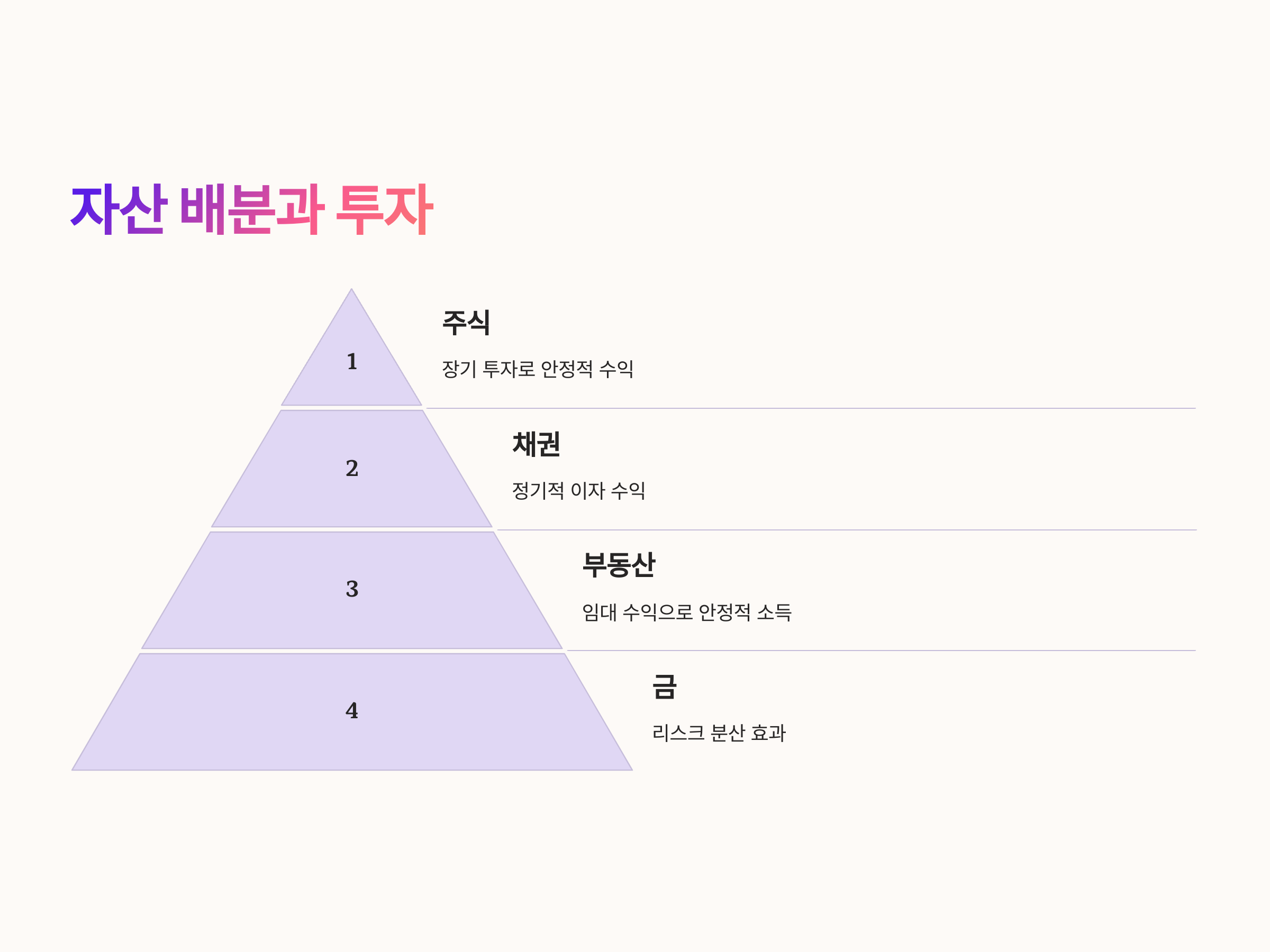 퇴직 후 경제적 독립을 위해서는 자산 배분이 매우 중요합니다. 주식, 채권, 부동산, 금 등 다양한 자산에 투자하여 리스크를 분산시켜야 합니다. 퇴직 전에는 안정적인 자산을 확보하고, 퇴직 후에는 자산을 늘려나갈 수 있는 전략을 구사해야 합니다.