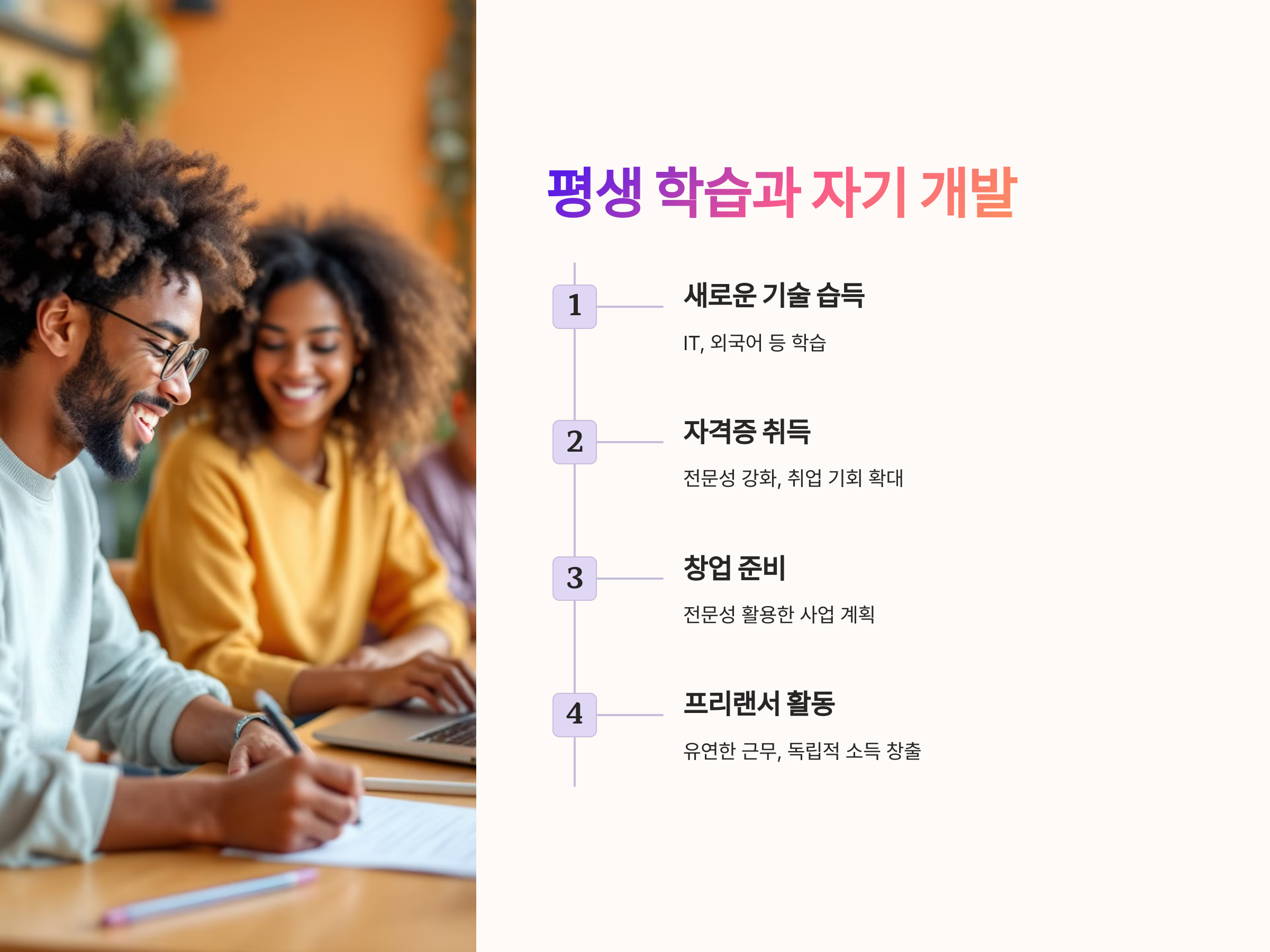 퇴직 후 경제적 독립을 이루기 위해서는 평생 학습과 자기 개발이 필수적입니다. 변화하는 경제 환경에서 새로운 기회를 찾고, 자기 자신을 끊임없이 발전시켜 나가는 것이 중요합니다.