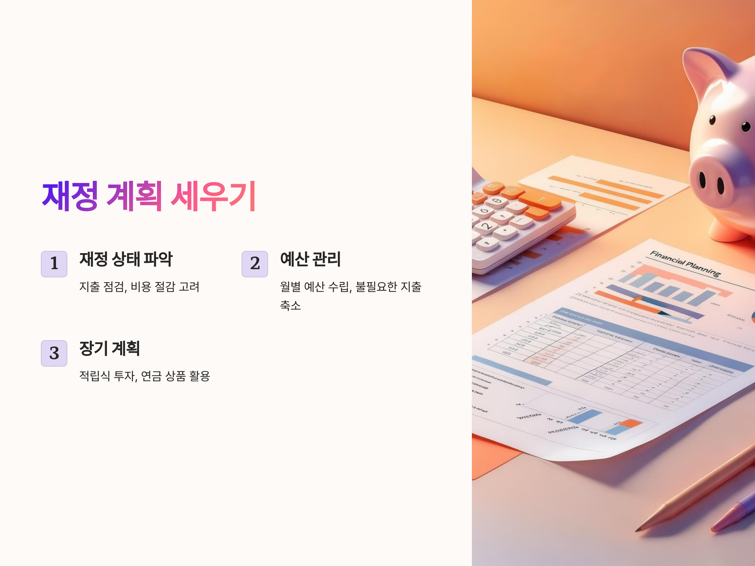 퇴직 후에도 안정적인 경제적 독립을 이루기 위해서는 자산을 꾸준히 늘려가는 것이 중요합니다. 월별 예산을 세워서 지출을 관리하고, 불필요한 지출을 줄여야 합니다. 또한, 적립식 투자나 연금 상품을 활용해 장기적인 재정 계획을 세우는 것이 좋습니다.