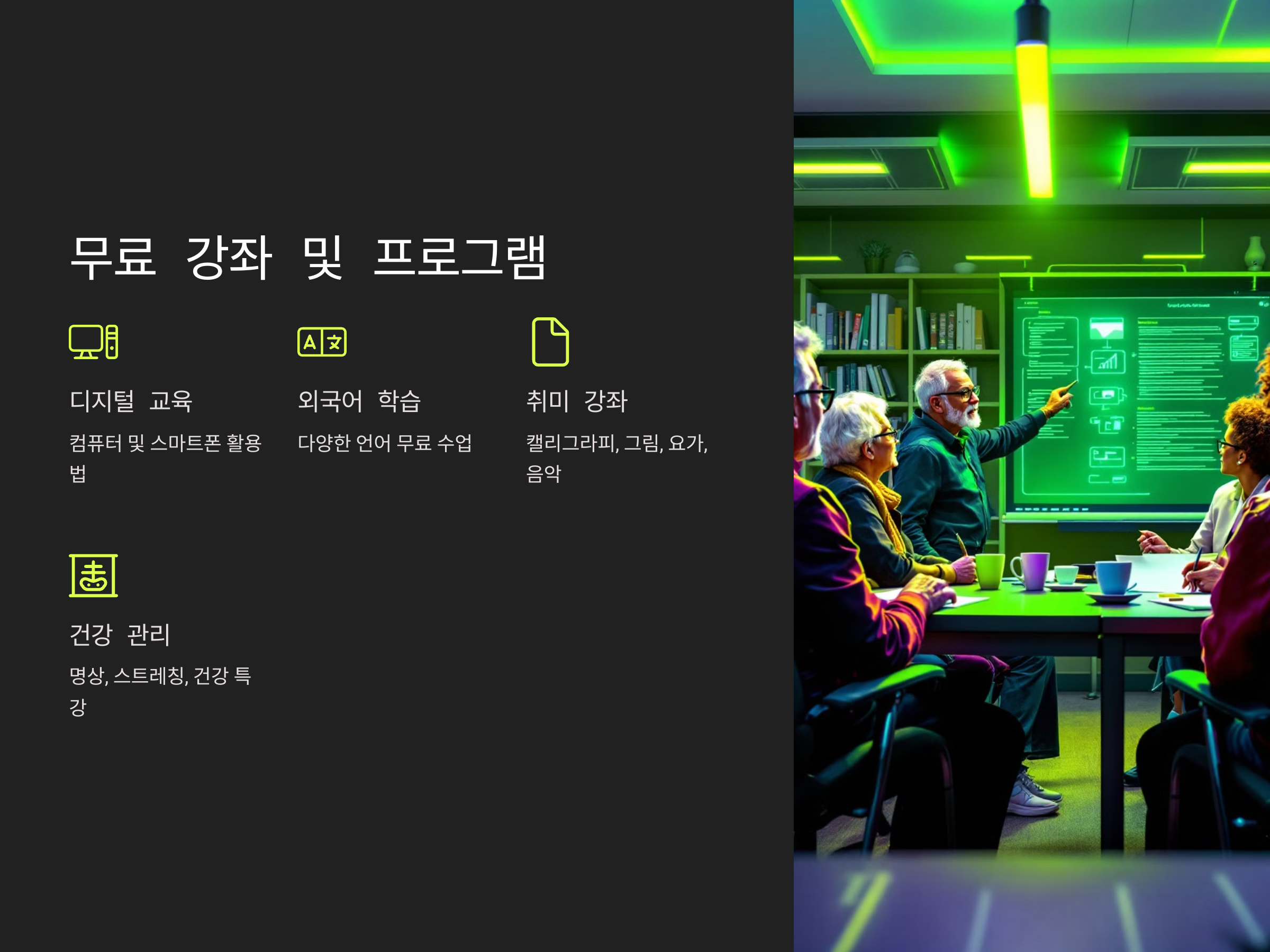 - 컴퓨터 및 스마트폰 활용 교육: 디지털 기기 사용법을 배우고 인터넷 활용 능력 향상
