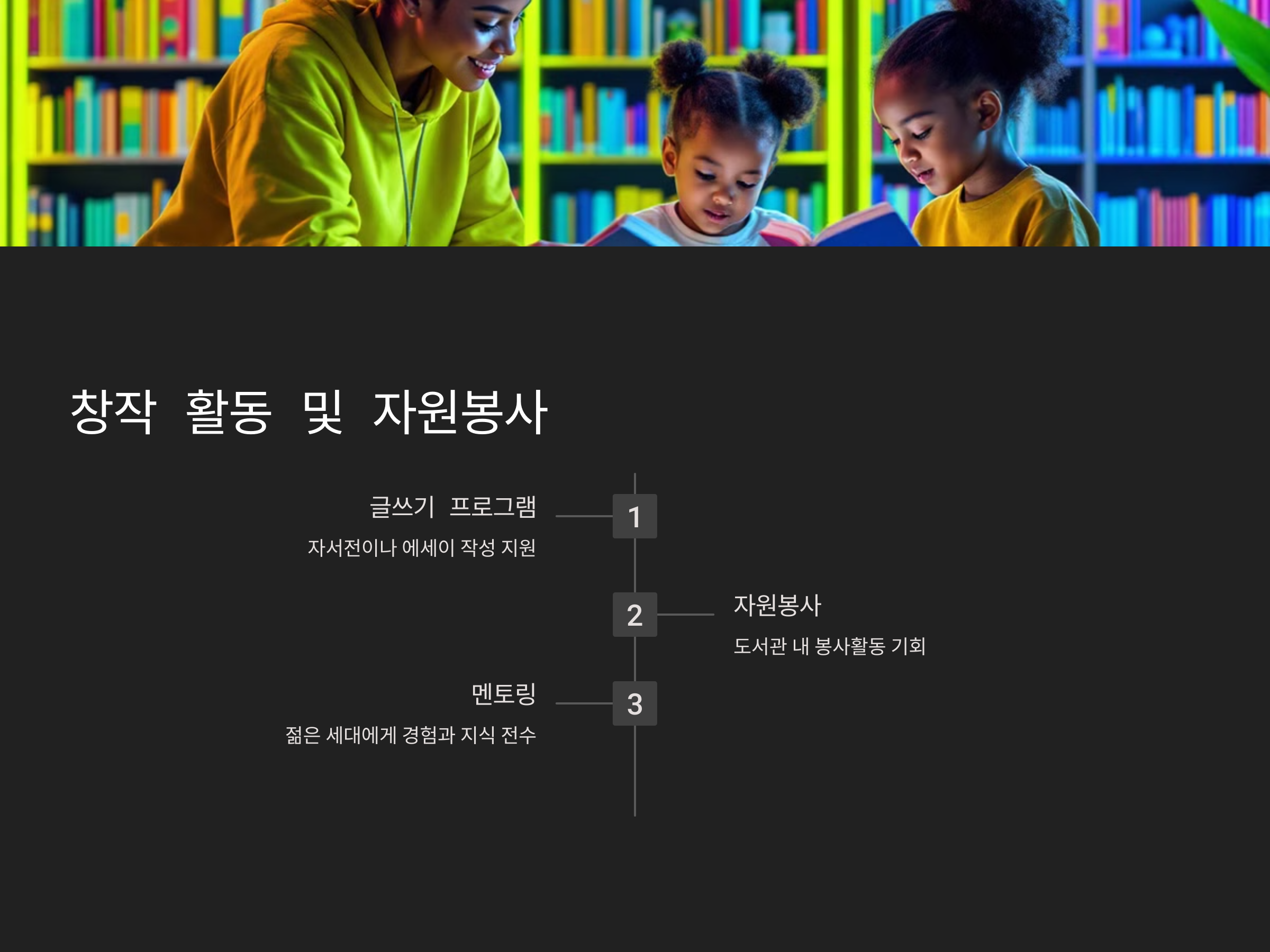 - 지역사회 자원봉사: 도서관 내 봉사활동을 통해 사회에 기여할 수 있는 기회 제공