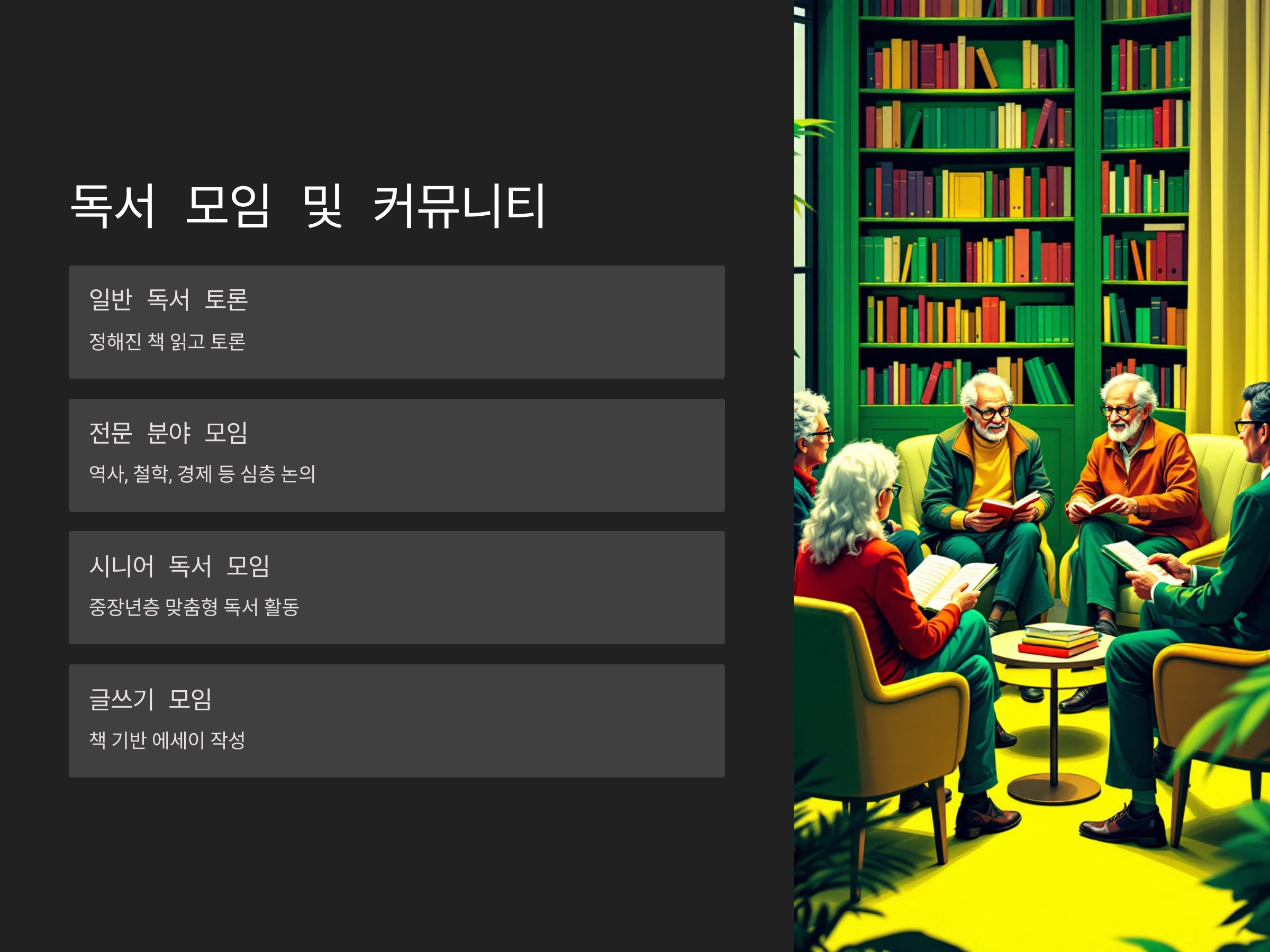 - 시니어 독서 모임: 퇴직자 및 중장년층을 위한 맞춤형 독서 활동
