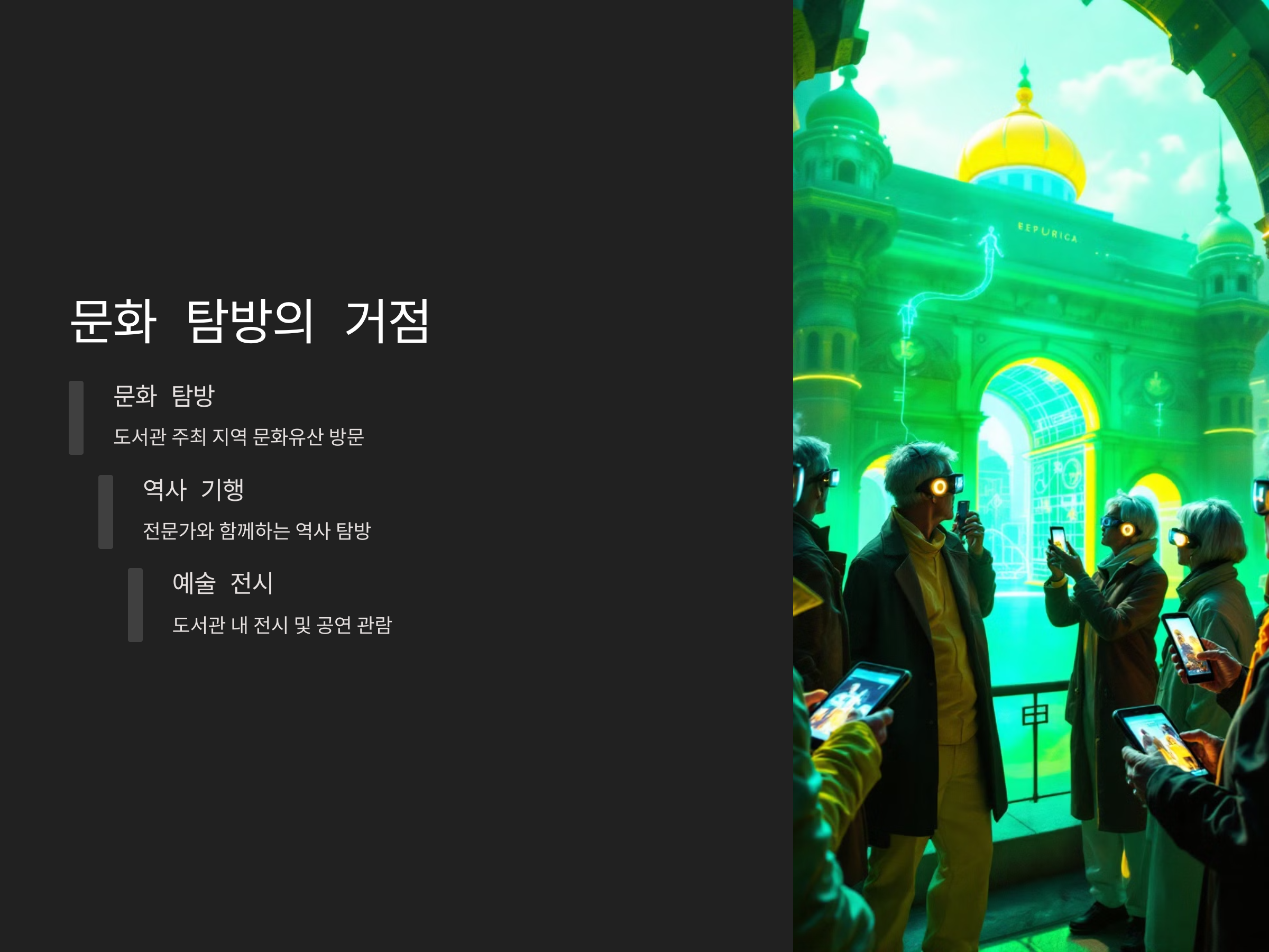 - 도서관 주최 문화 탐방: 지역 문화유산과 명소 방문