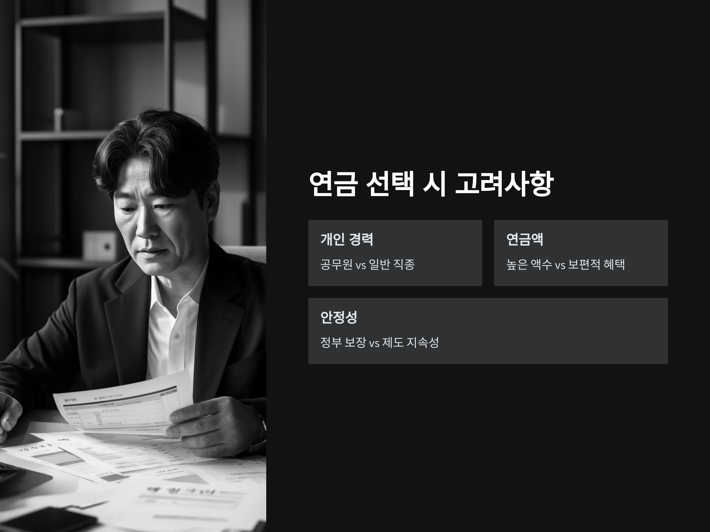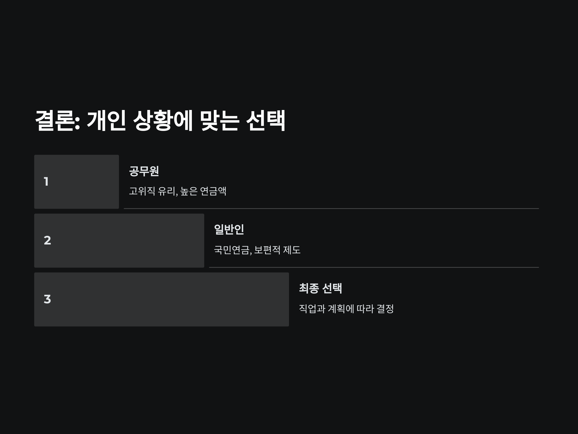퇴직 후 연금을 선택하는 데 있어 중요한 점은 개인의 경력과 직업에 따라 다를 수 있습니다. 공무원 연금은 고위직 공무원에게 더 유리하며, 상대적으로 높은 연금액을 보장합니다. 반면 국민연금은 보편적인 제도로, 공무원이 아닌 대다수의 사람들이 가입하는 연금입니다. 두 연금 모두 퇴직 후 경제적 안정성을 제공하지만, 가입 조건과 연금액에서 차이가 나므로 본인의 직업과 계획에 따라 선택하는 것이 중요합니다.