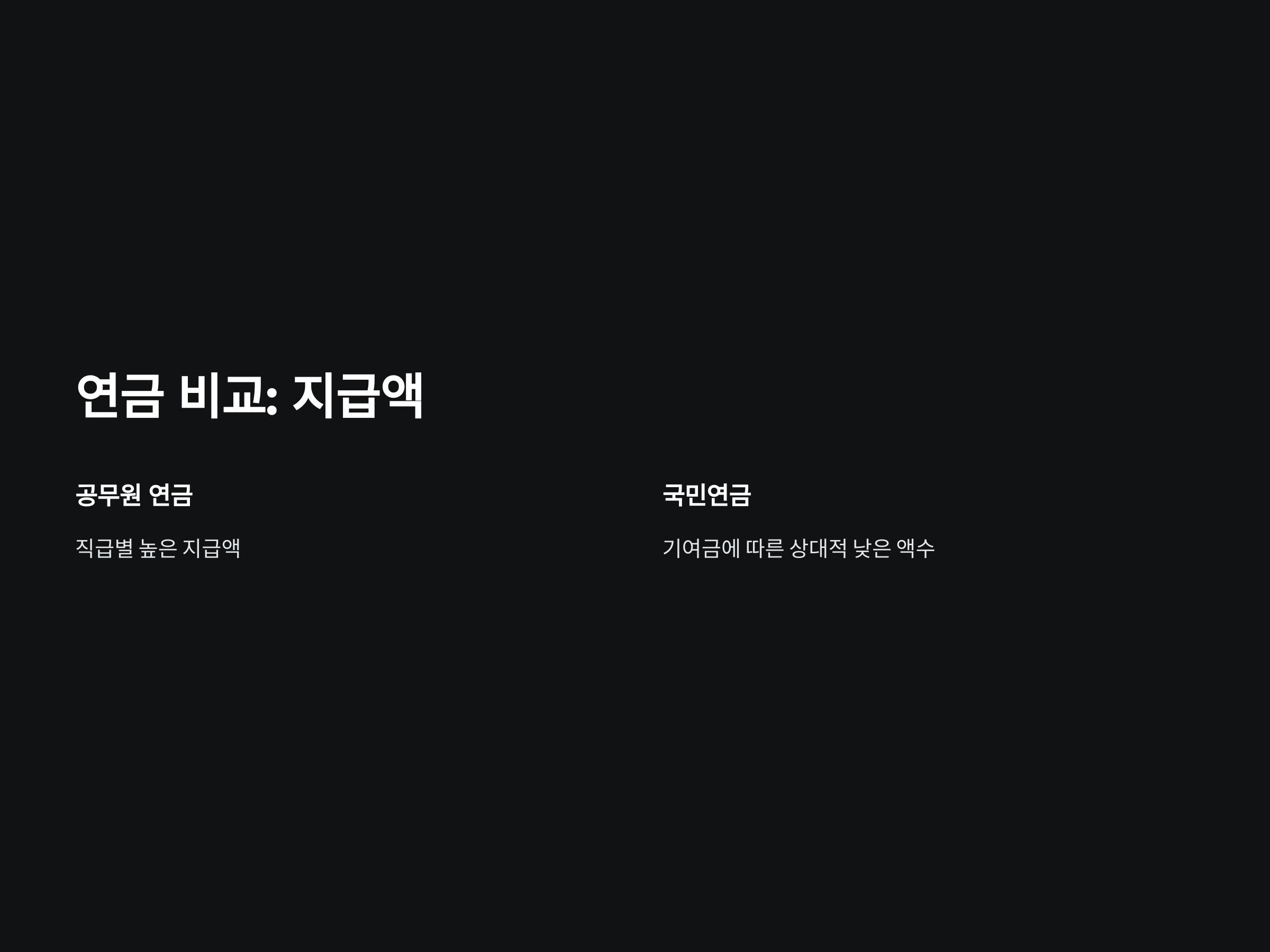 공무원 연금은 직급별로 지급액이 달라져 높은 직급에서 퇴직한 사람들은 매우 높은 연금을 받을 수 있습니다. 반면, 국민연금은 가입자의 기여금에 따라 연금액이 결정되므로 지급액이 상대적으로 낮습니다.