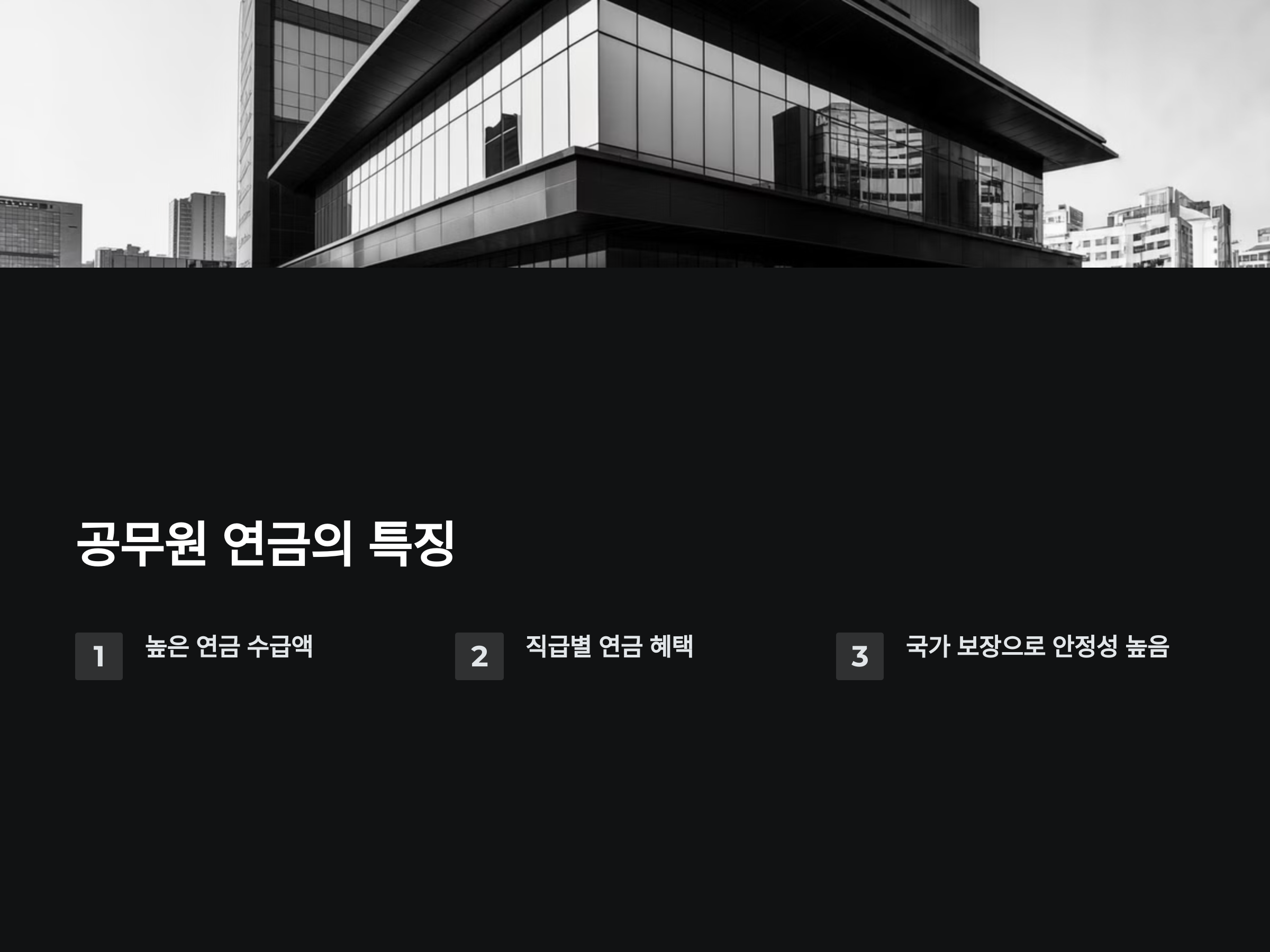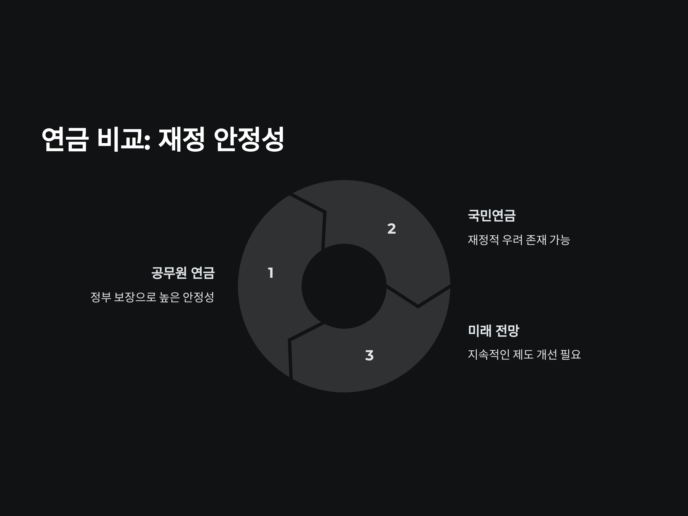 - 국가 보장: 공무원 연금은 국가가 보장하는 연금 제도이기 때문에 지급 불능 위험이 적습니다.