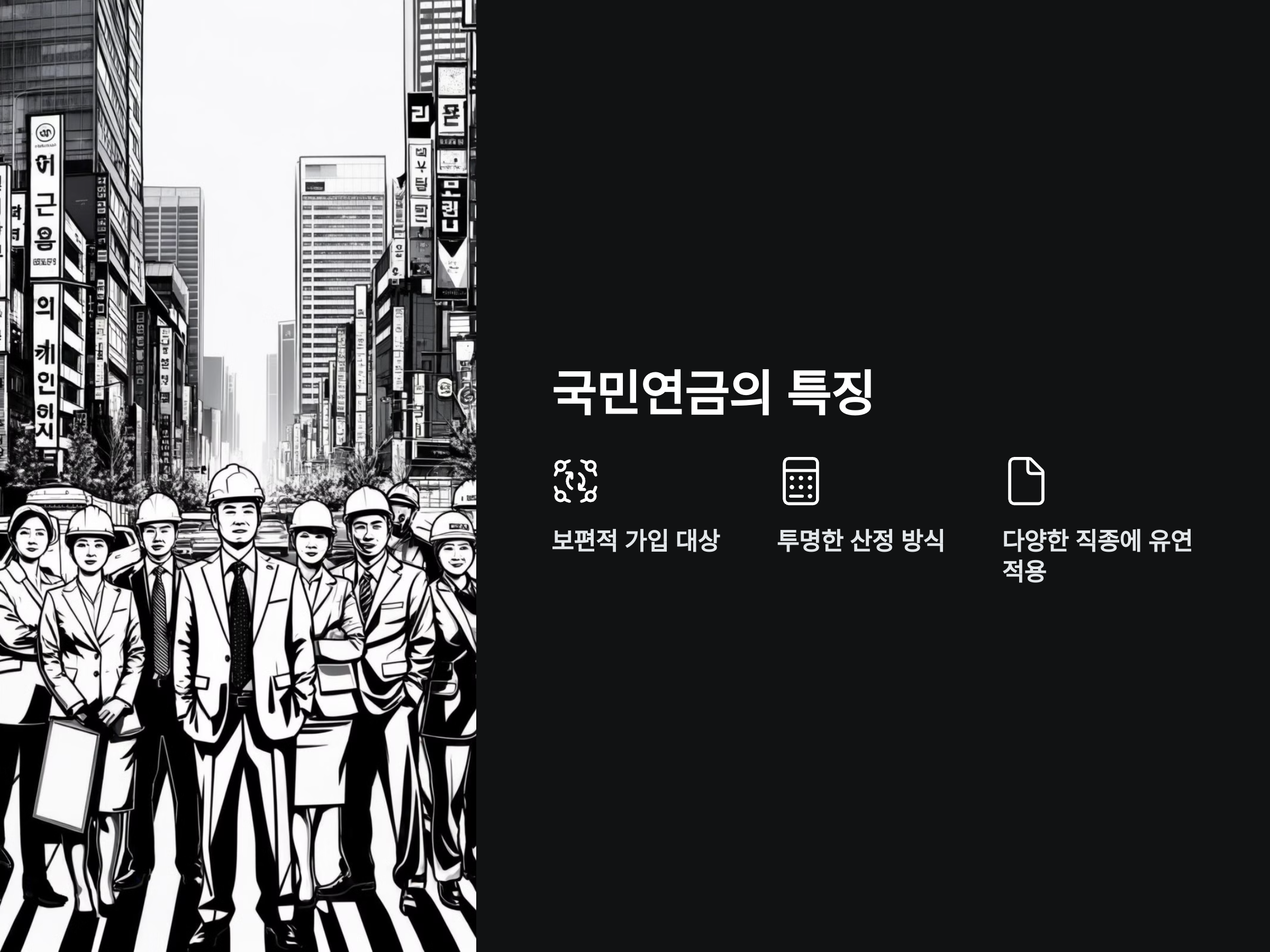 - 유연성: 국민연금은 직장뿐만 아니라 자영업자도 가입할 수 있어 다양한 직종에 유연하게 적용될 수 있습니다.