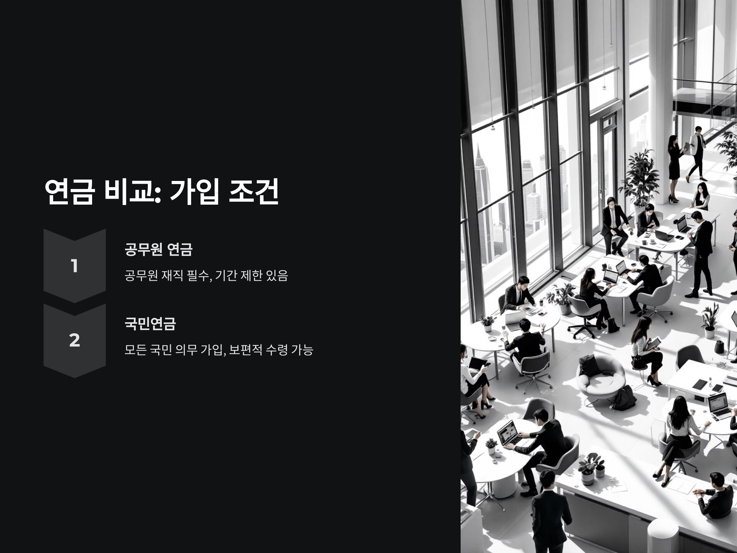 - 가입 조건이 엄격함: 공무원 연금은 공무원으로 재직 중인 사람만 가입할 수 있습니다. 일반적인 직장인들은 국민연금에 가입하게 됩니다.