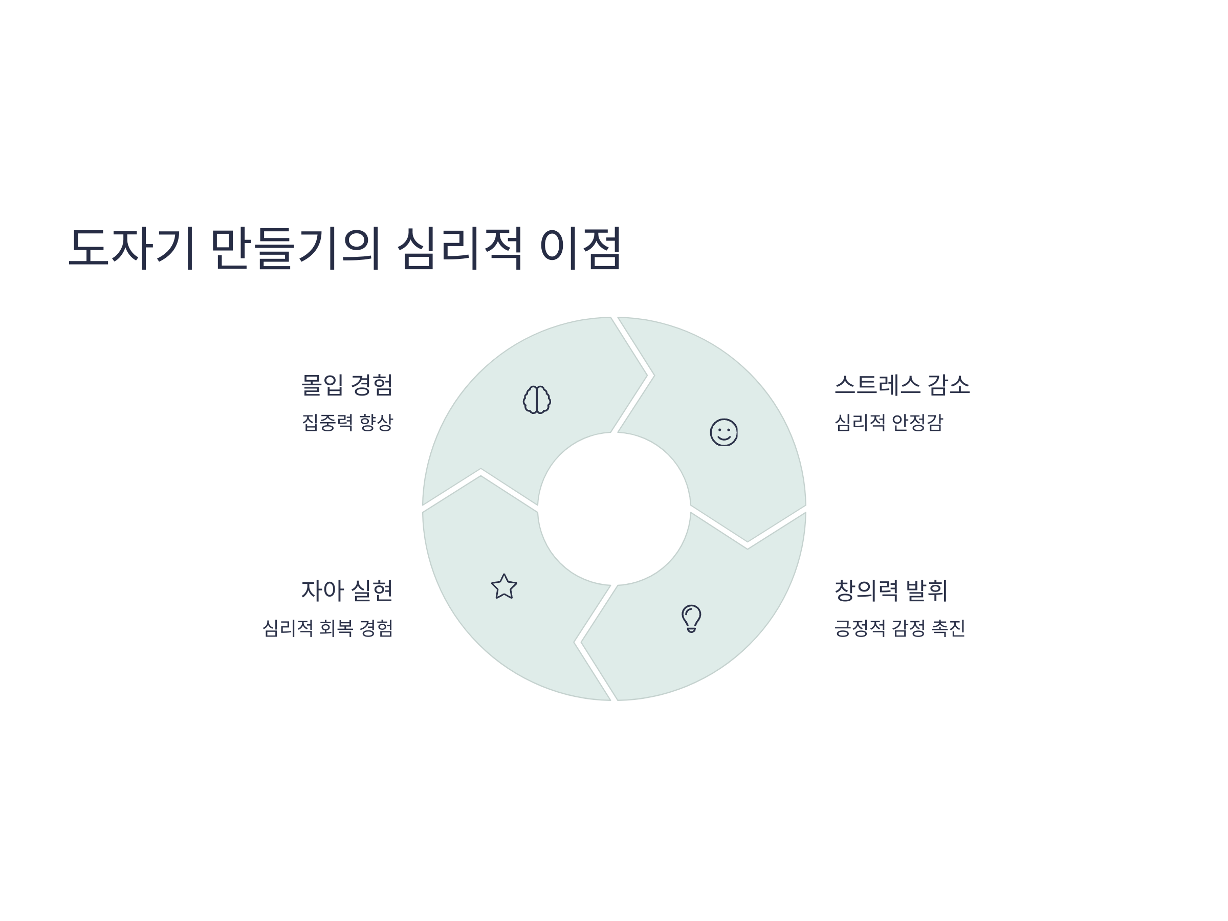 도자기 만들기는 단순한 취미 활동을 넘어 심리적인 이점을 제공합니다. 퇴직 후 시간이 많아진 사람들에게, 도자기 만드는 과정은 몰입과 창의력 발휘의 기회를 제공합니다. 손으로 만드는 활동은 스트레스 해소에 매우 효과적이며, 심리적으로 안정된 상태를 유지하는 데 도움이 됩니다.