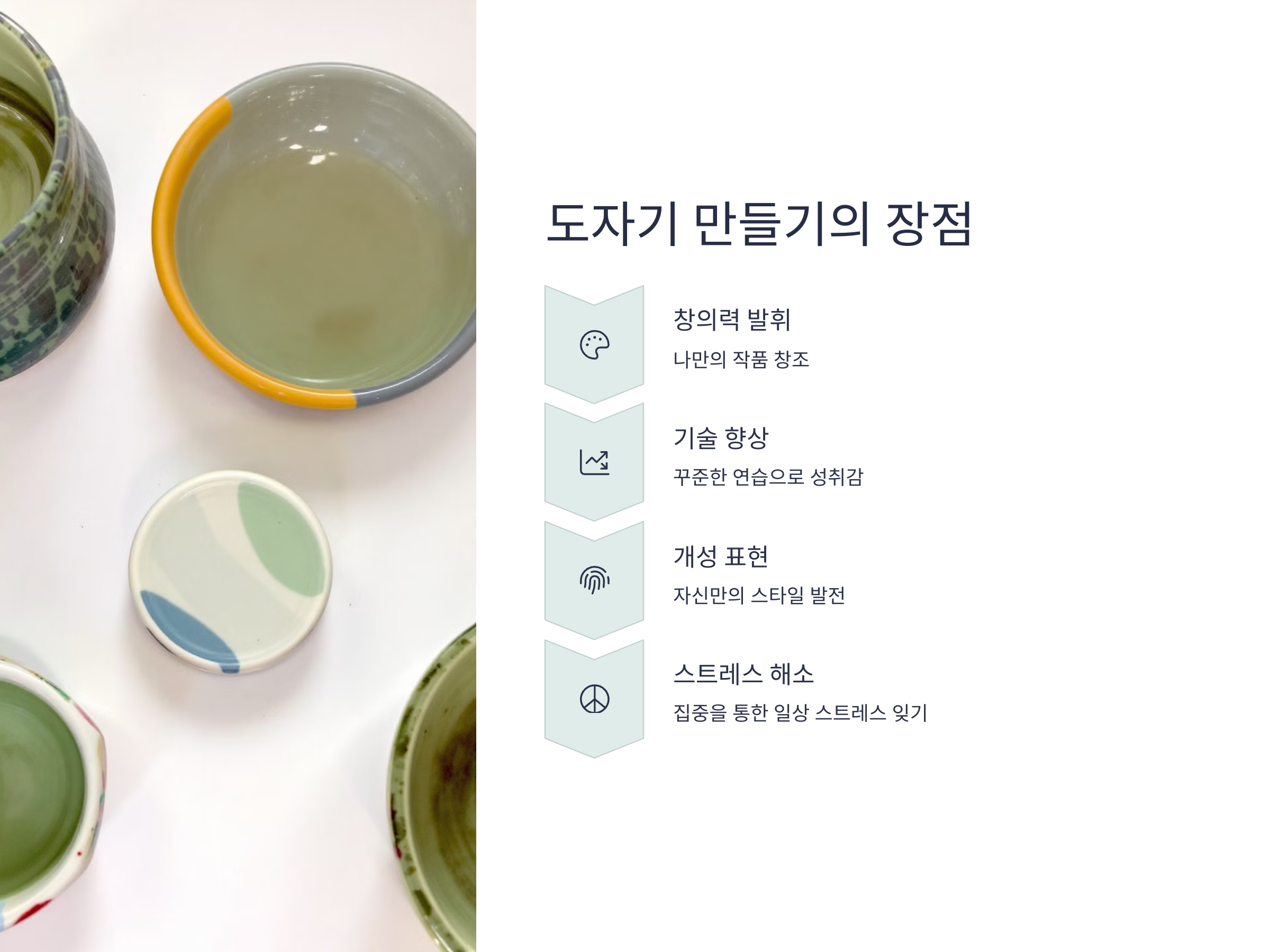 도자기를 만드는 과정은 반복적인 작업이지만, 그 안에서 점차적으로 자신의 스타일을 발전시킬 수 있습니다. 나만의 디자인을 창조하고, 다양한 기법을 시도하는 과정에서 끊임없이 새로운 것을 배우고 경험하는 즐거움을 느낄 수 있습니다. 또한, 도자기를 만드는 동안 집중하게 되어 일상에서의 스트레스를 잊을 수 있습니다.