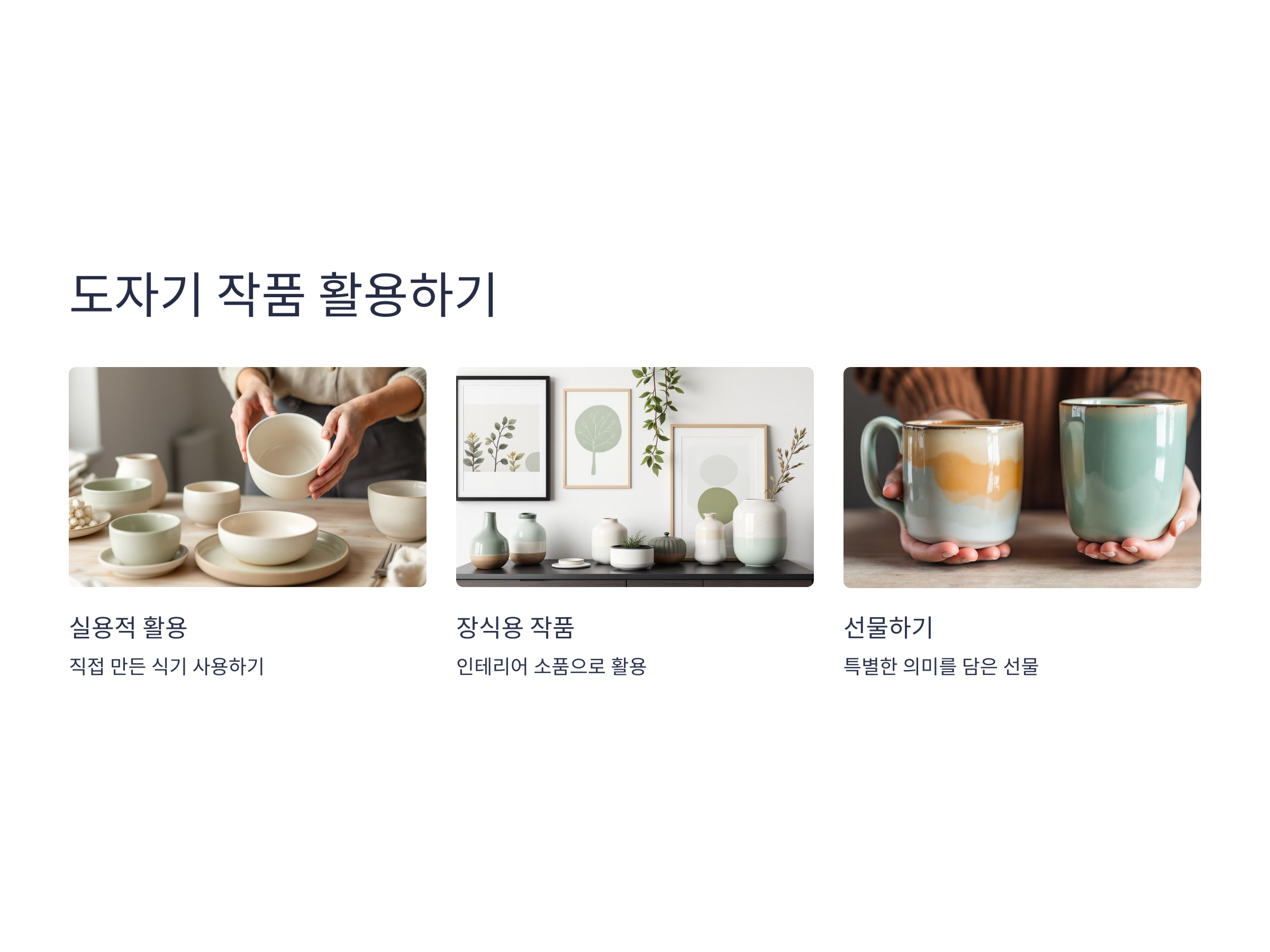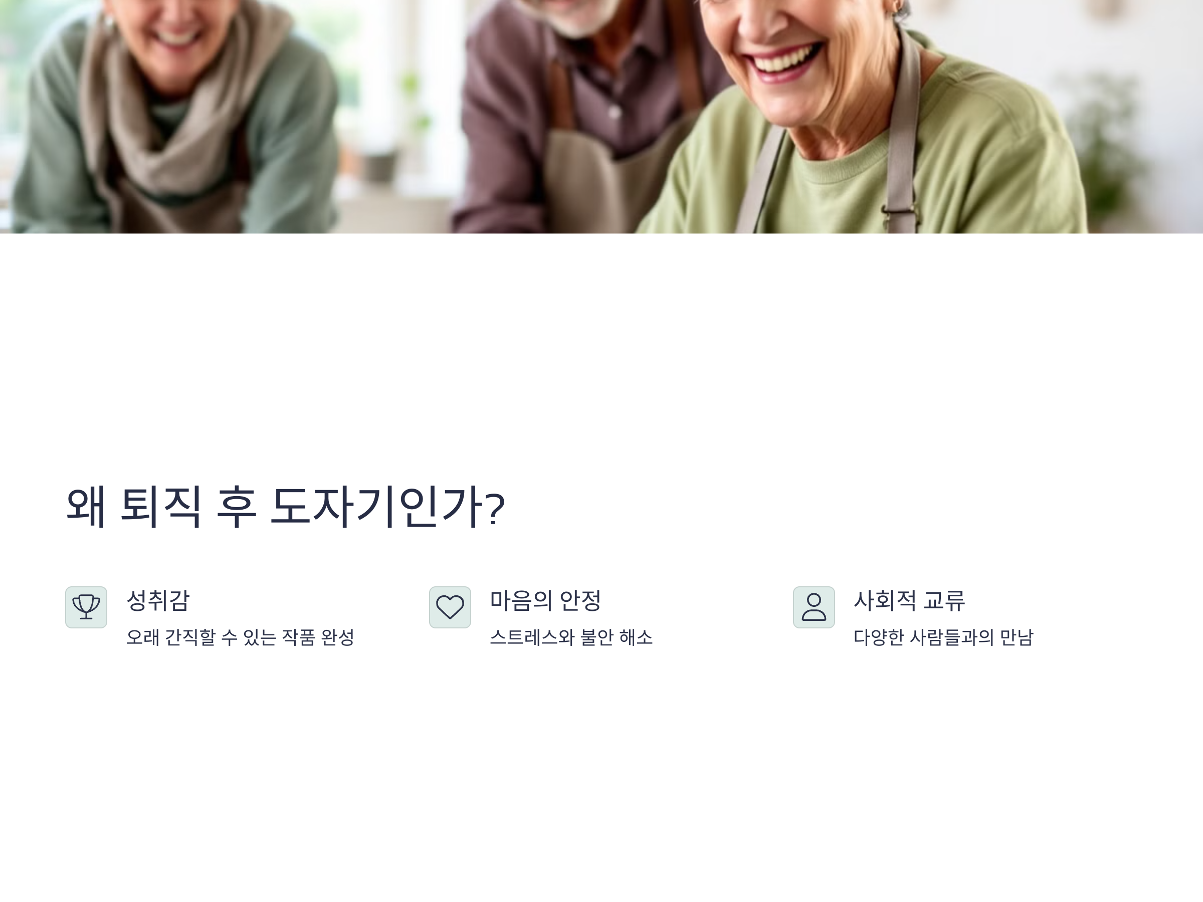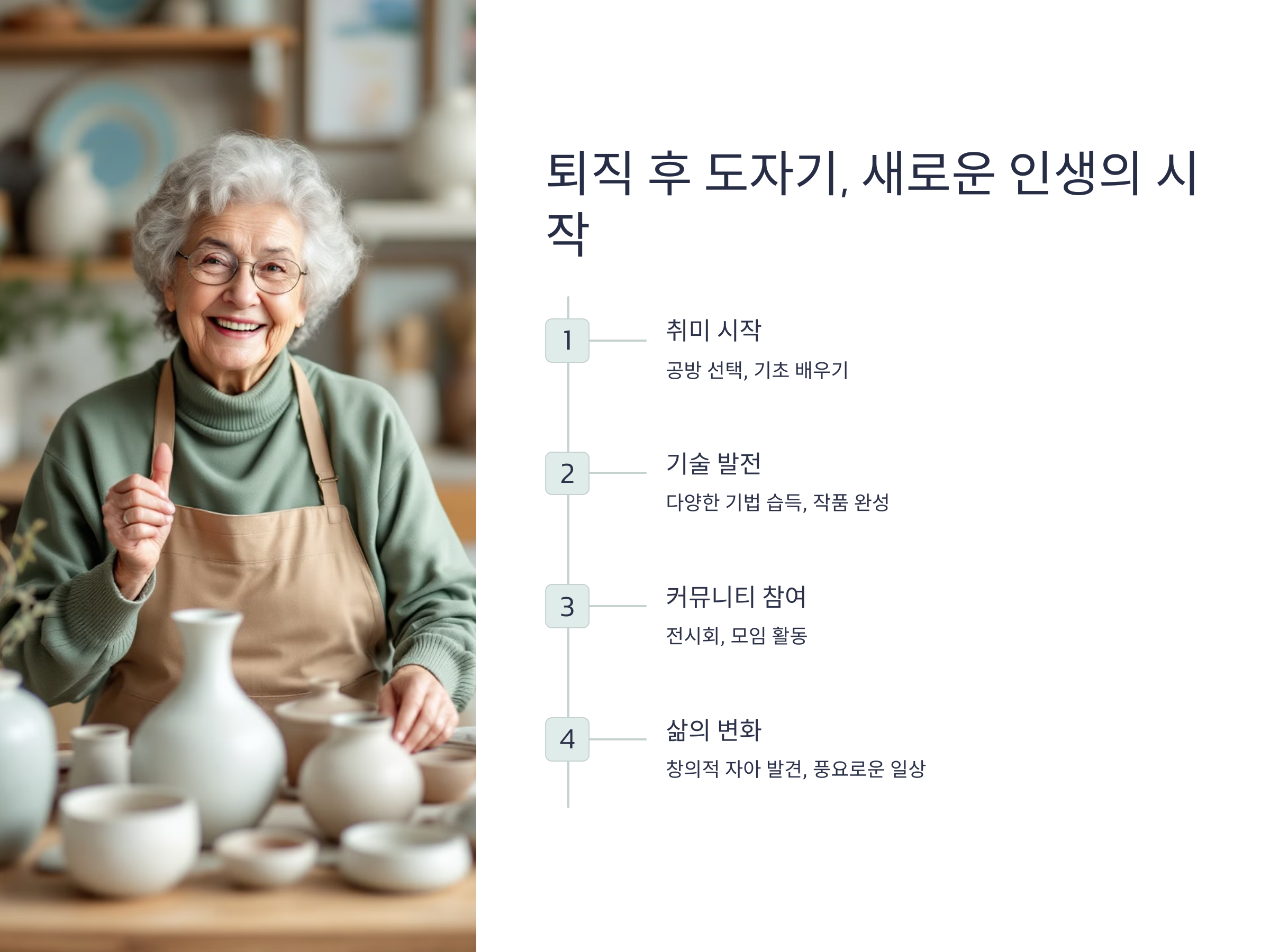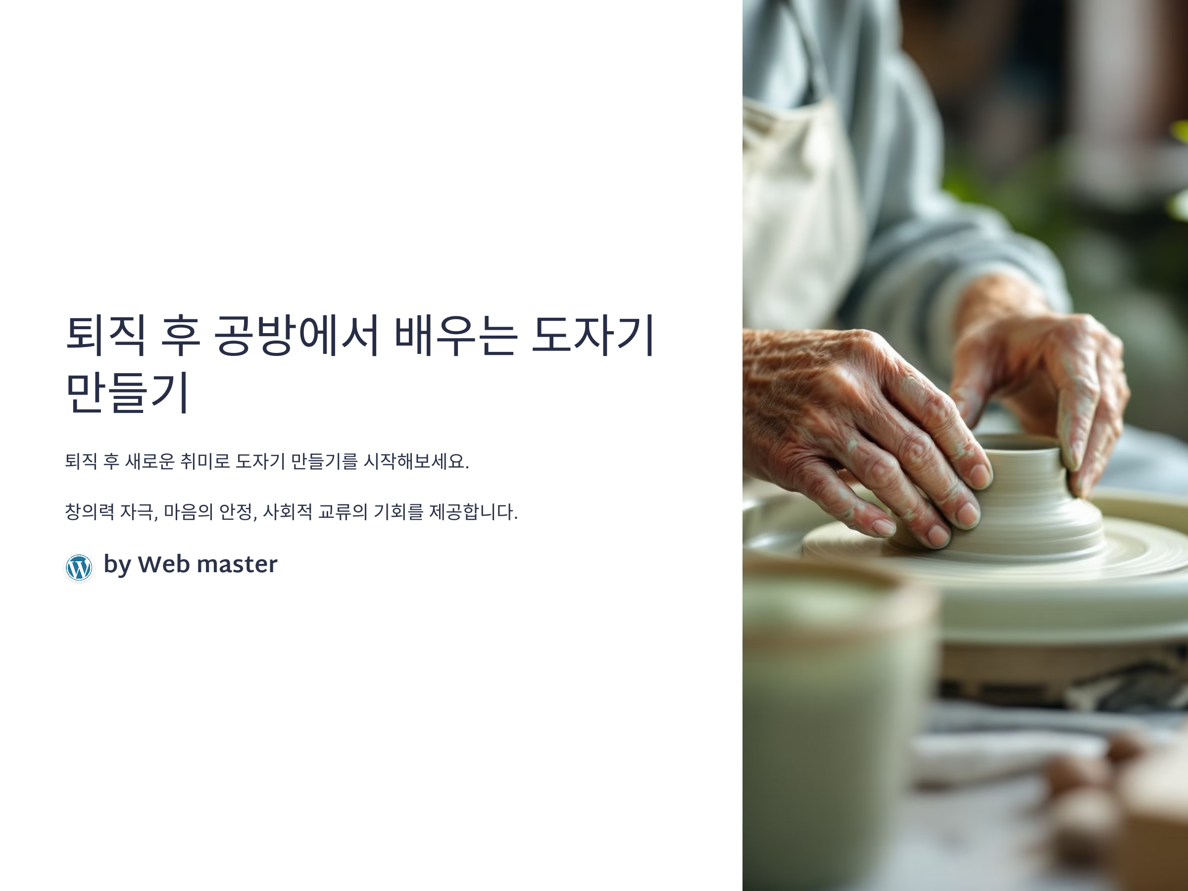 도자기 만들기를 통해 새로운 사람들과 교류하고, 나만의 작품을 만들어 보는 경험은 퇴직 후 삶을 더욱 풍요롭게 만듭니다. 이제 도자기 공방에서 배우는 이 새로운 도전을 시작해 보세요. 새로운 취미가 여러분의 삶에 어떤 긍정적인 변화를 가져올지 기대되지 않으신가요?