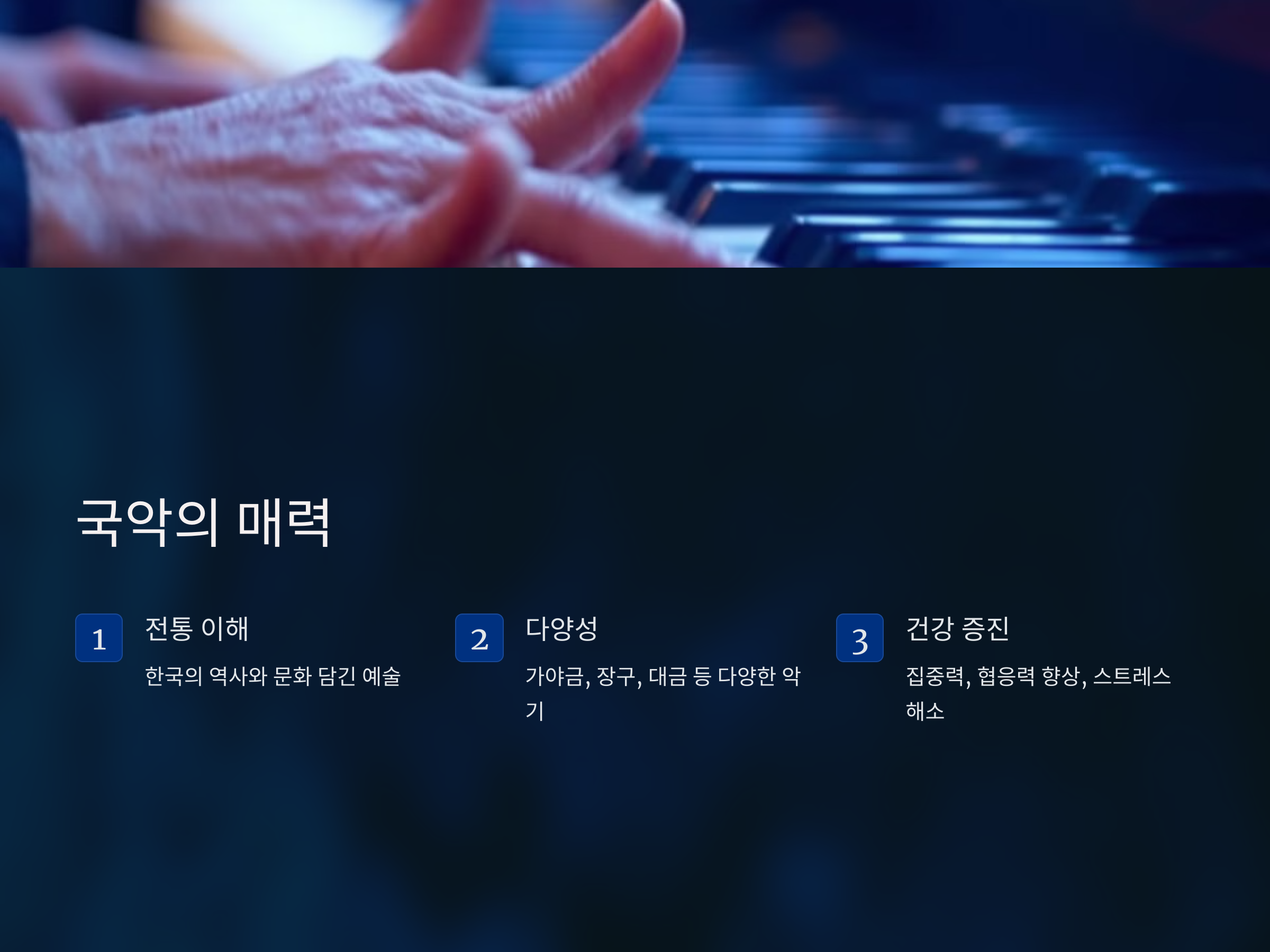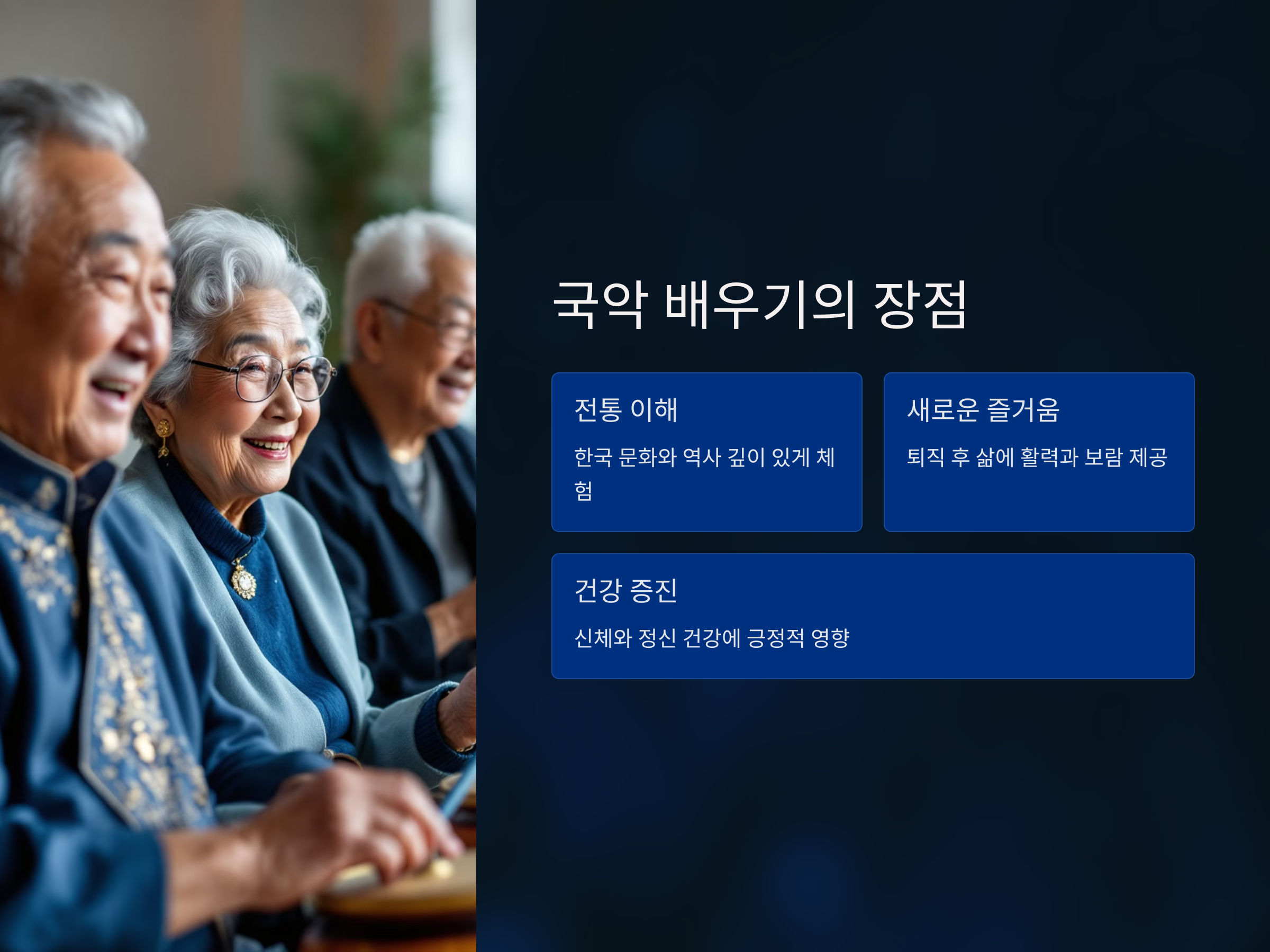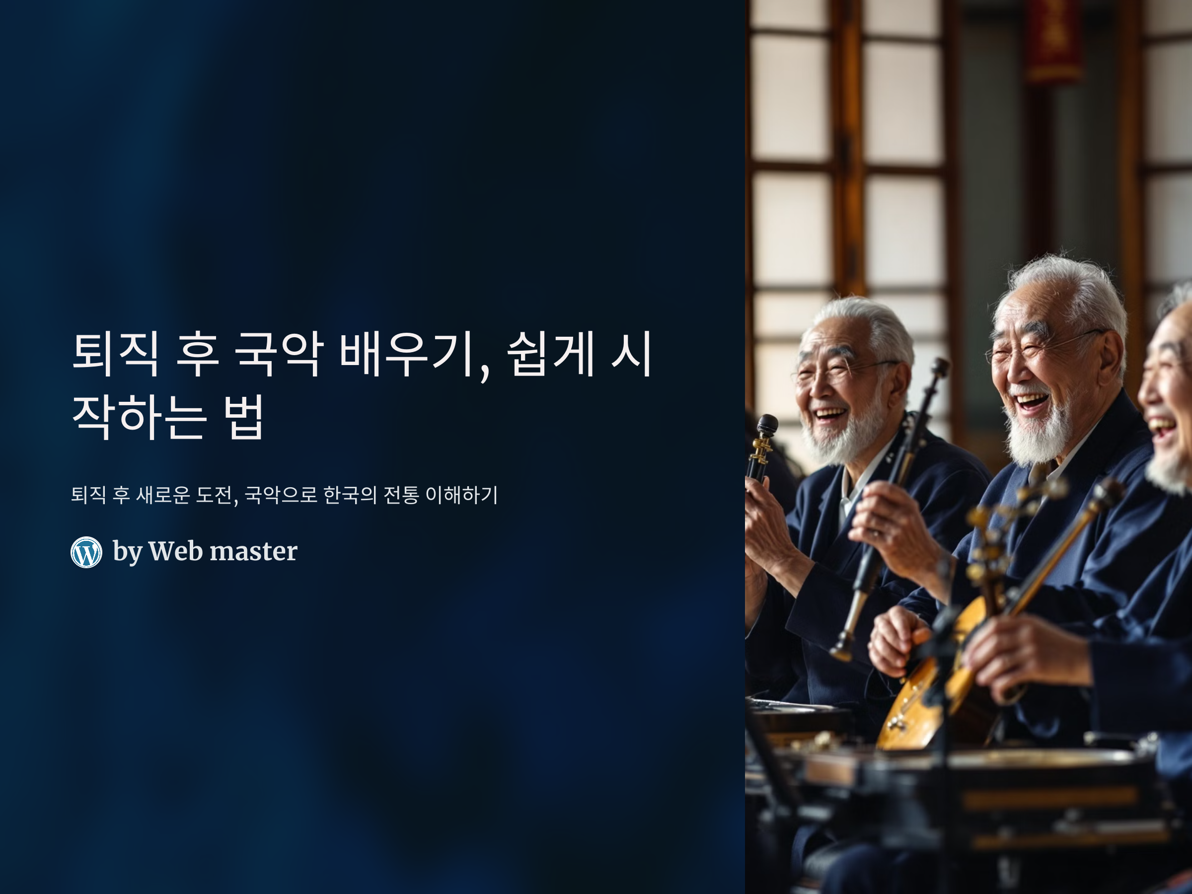 국악은 단순한 음악이 아니라 한국의 역사와 전통을 담고 있는 예술입니다. 퇴직 후 시간이 많아지면 자신만의 취미를 찾고, 그에 몰입하는 시간을 가질 수 있습니다. 국악을 배우는 것은 단순히 음악을 연주하는 것이 아니라, 한국의 전통을 깊이 이해하고 느끼는 과정입니다.
