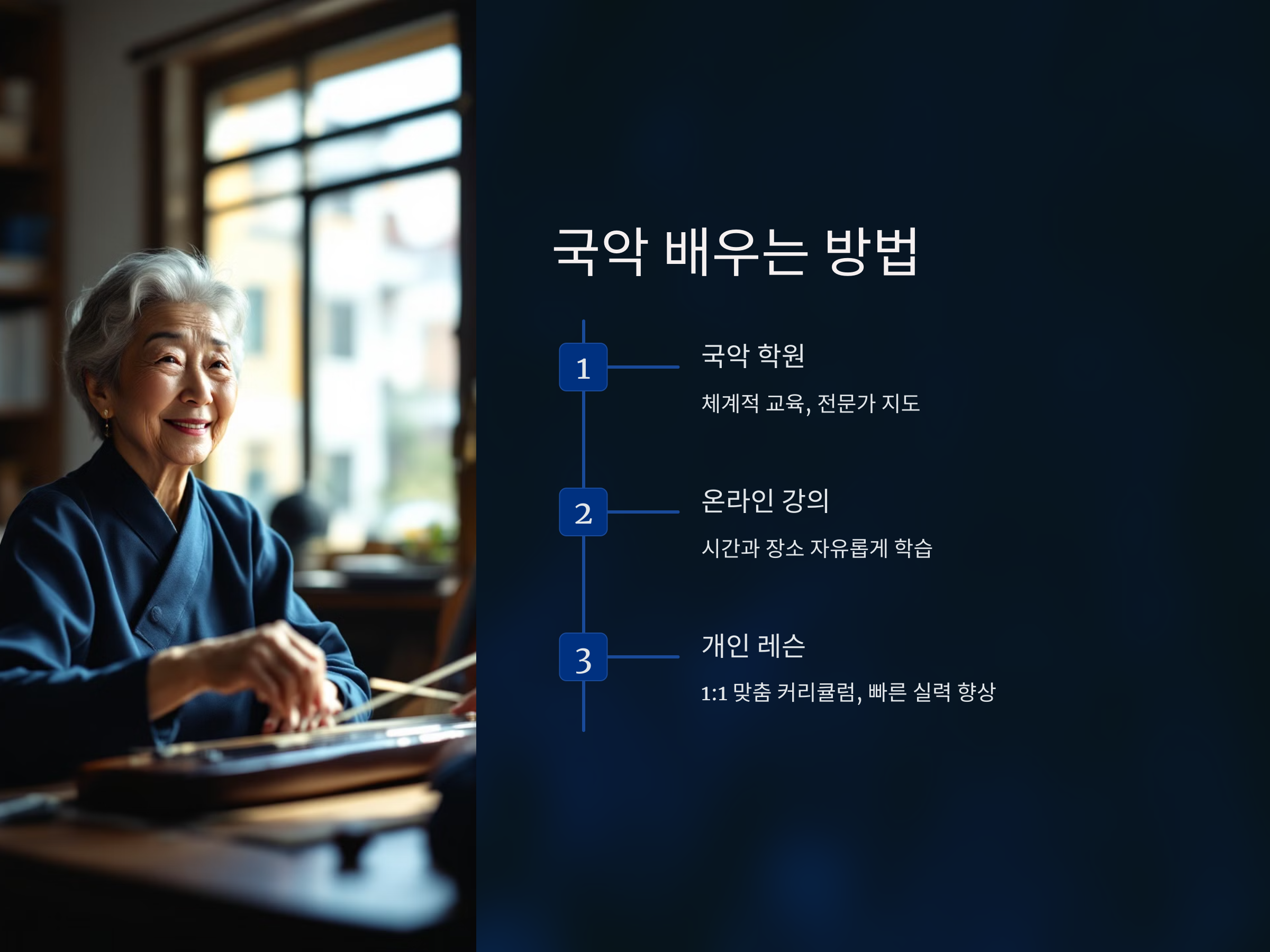 가장 일반적인 방법은 국악 학원에 다니는 것입니다. 학원에서는 체계적인 교육을 받을 수 있으며, 전문가의 지도를 받으며 빠르게 배울 수 있습니다. 퇴직 후 시간이 여유롭다면 학원에 다니는 것이 좋습니다.