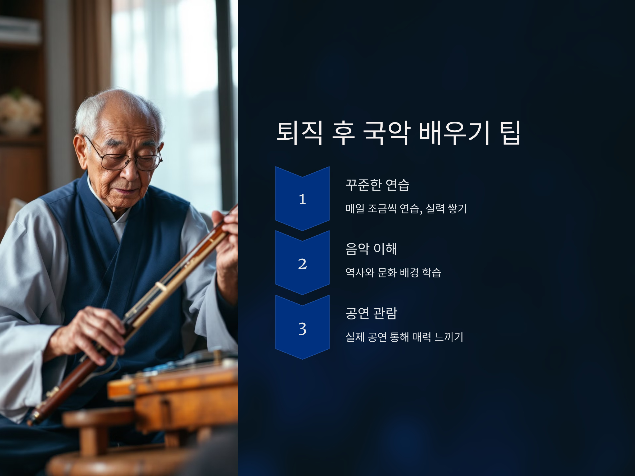 국악을 배우는 과정은 시간이 걸리더라도 그만큼의 가치가 있는 경험입니다. 퇴직 후에 국악을 배우며 새로운 즐거움과 보람을 느껴보세요.