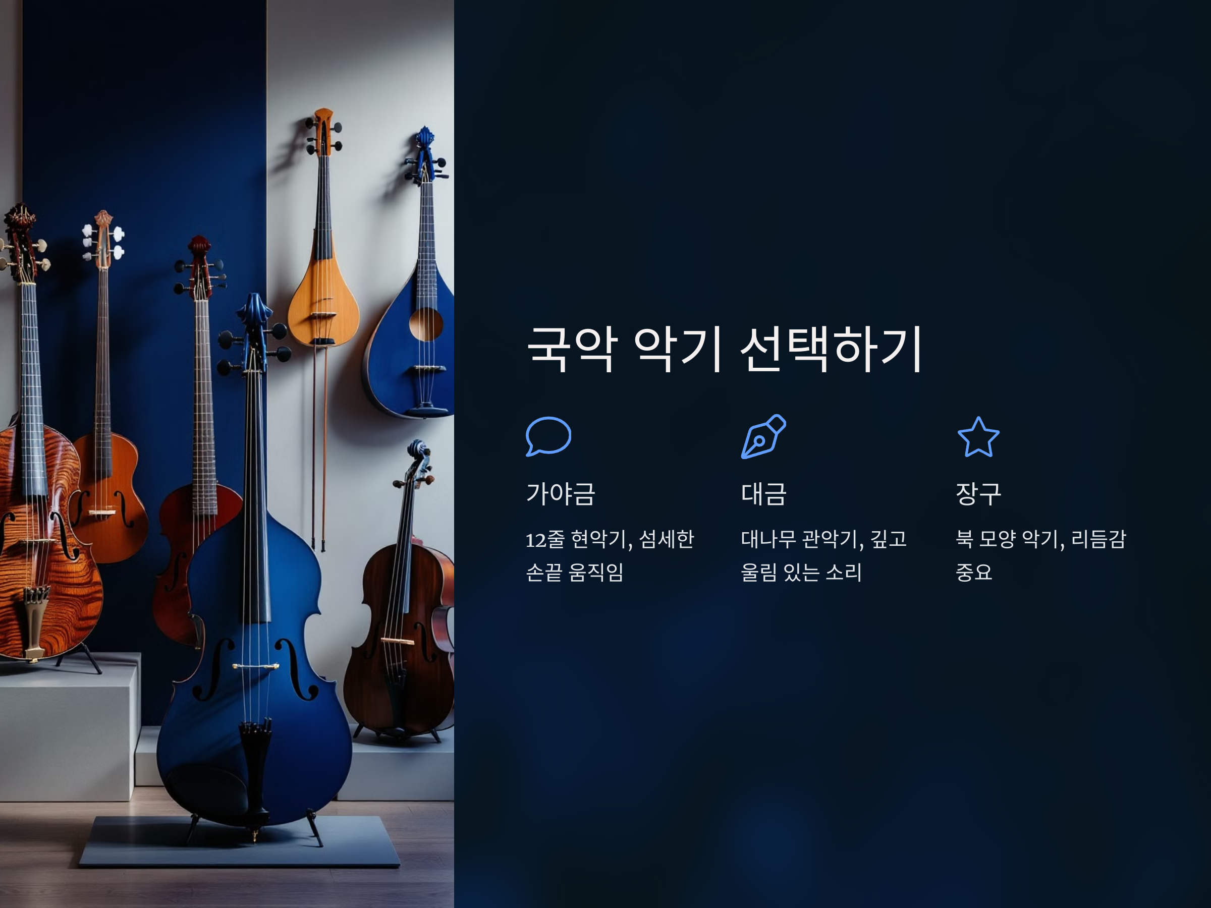 이 외에도 국악에는 다양한 악기와 장르가 존재하므로, 자신의 성향에 맞는 악기를 선택하는 것이 중요합니다.