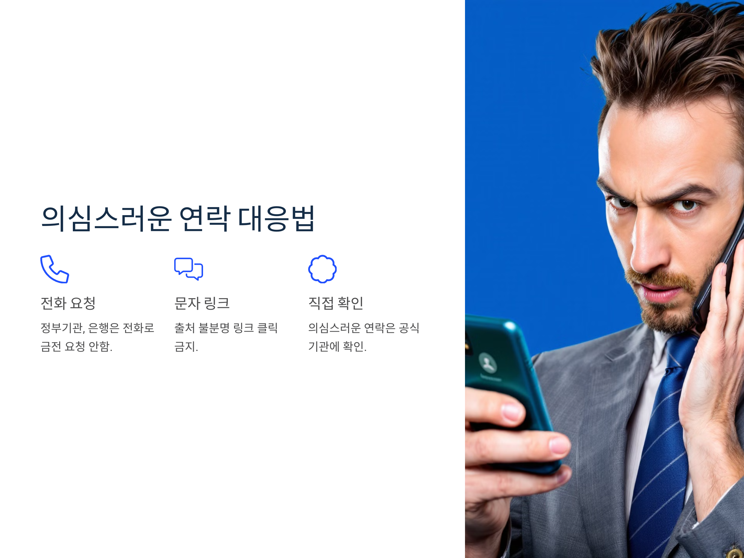 - 정부기관, 은행, 경찰청 등은 전화나 문자로 금전 요청을 하지 않습니다.