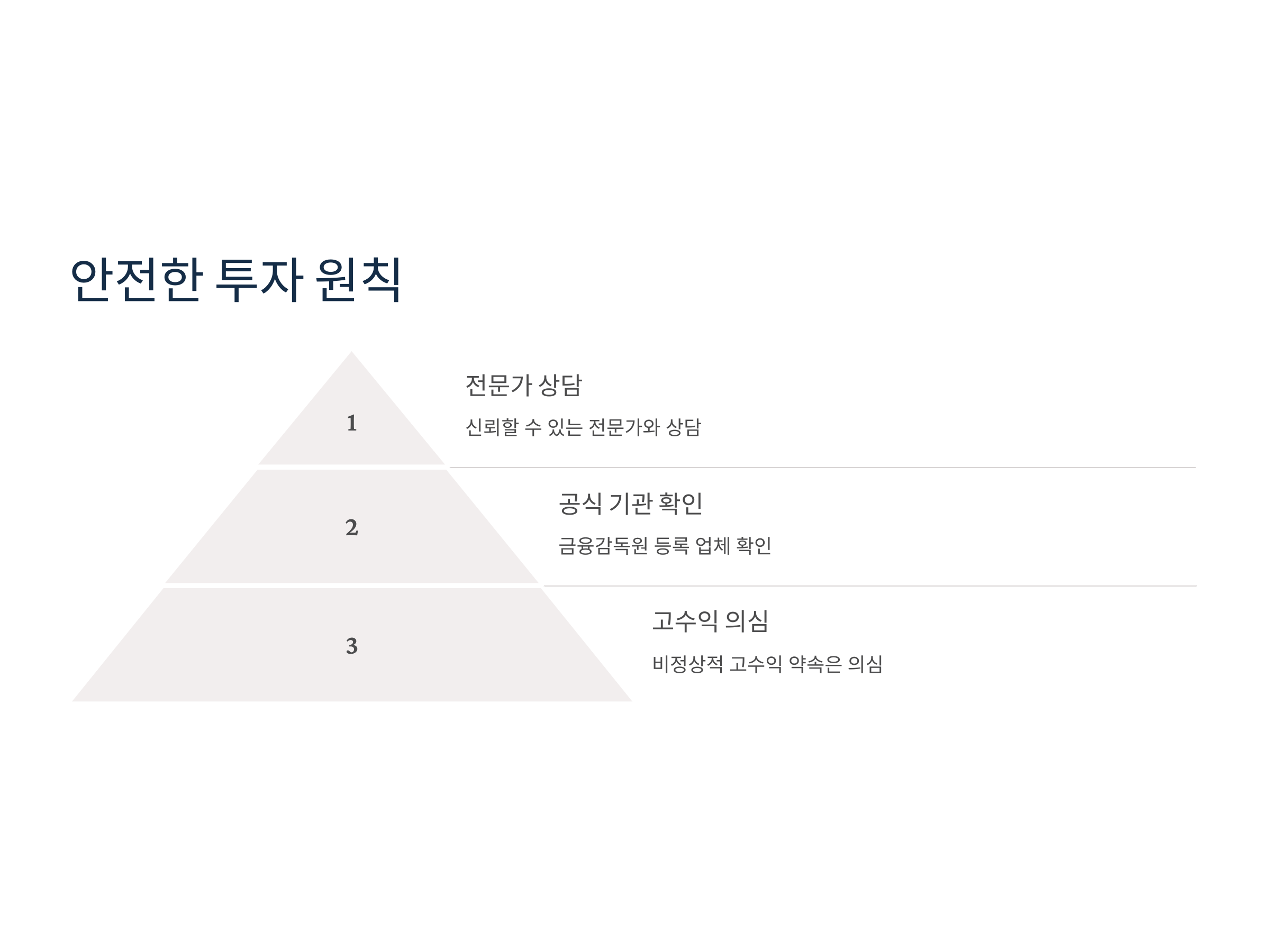 - "고수익 보장"을 내세우는 투자 상품은 반드시 의심해야 합니다.