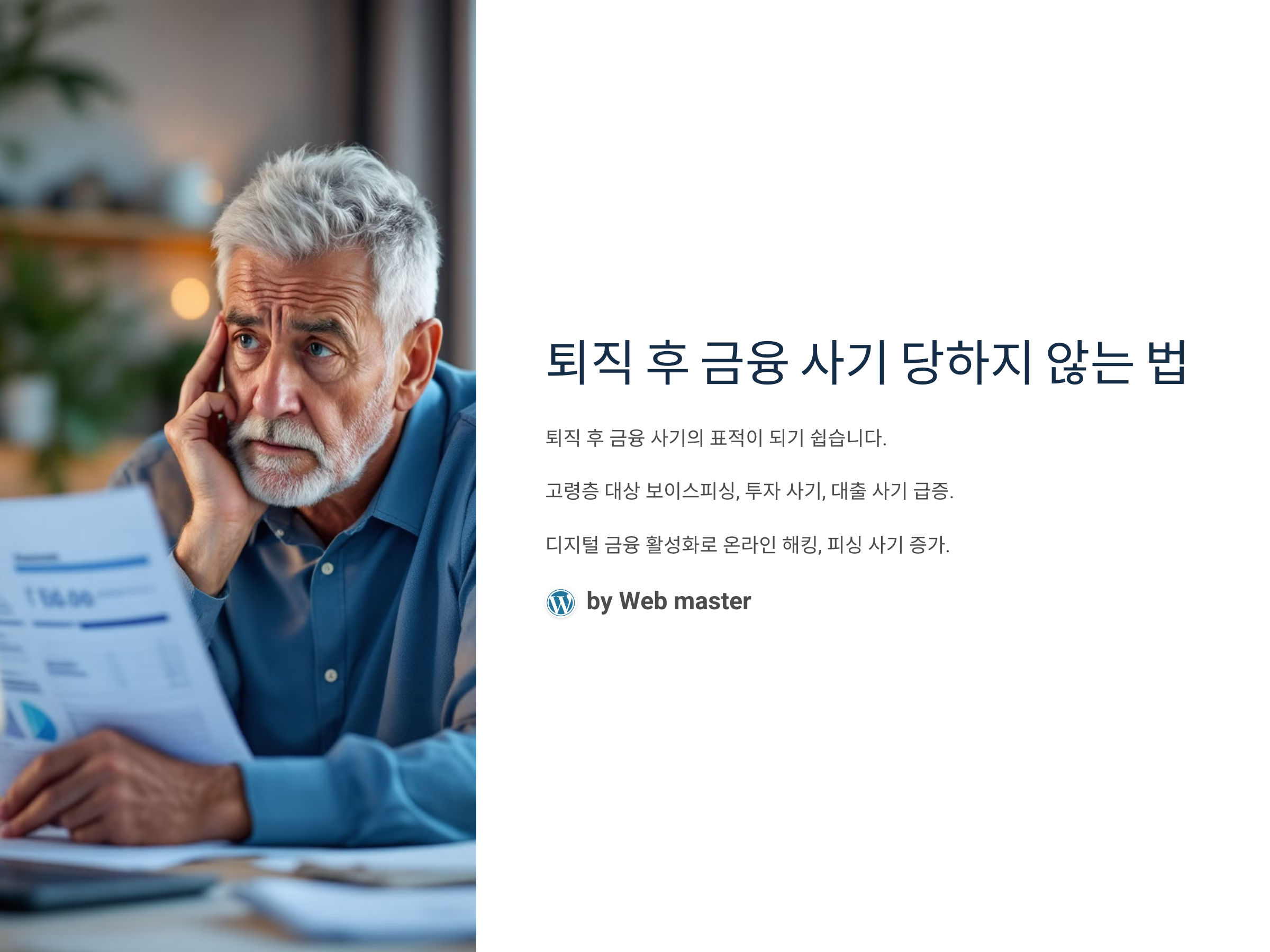 퇴직 후에는 경제적 여유를 누려야 하지만, 이 시기는 동시에 금융 사기의 표적이 되기 쉽습니다. 최근 고령층을 대상으로 한 보이스피싱, 투자 사기, 대출 사기 등의 금융 범죄가 급증하고 있으며, 디지털 금융이 활성화되면서 온라인 해킹이나 피싱 사기도 증가하는 추세입니다. 금융 사기를 예방하려면 최신 사기 유형을 알고, 금융 거래 시 주의해야 할 사항을 숙지하며, 신뢰할 수 있는 기관을 이용하는 것이 중요합니다. 이 글에서는 퇴직 후 금융 사기를 피하는 방법과 안전한 재정 관리 전략을 상세히 소개합니다.