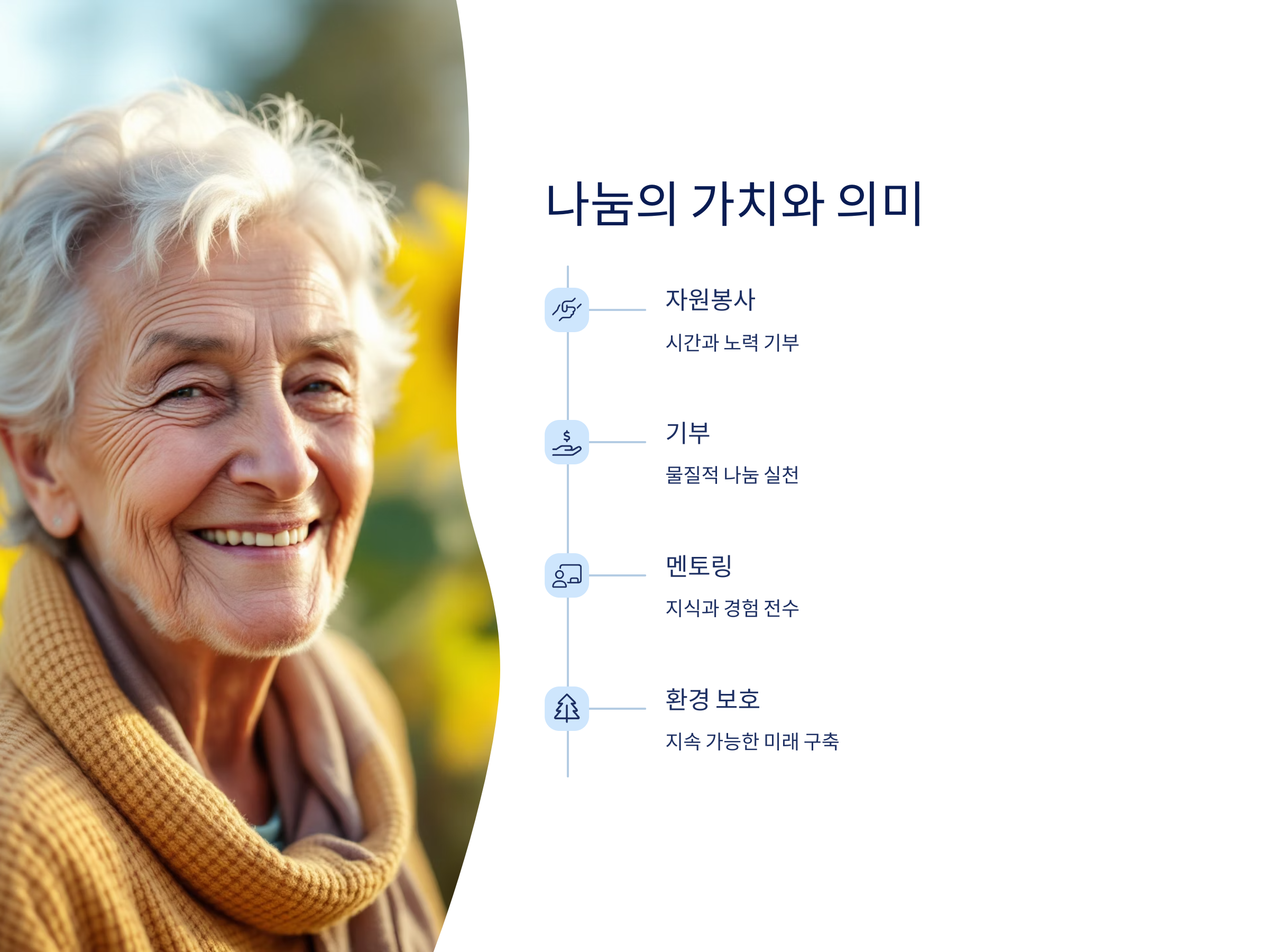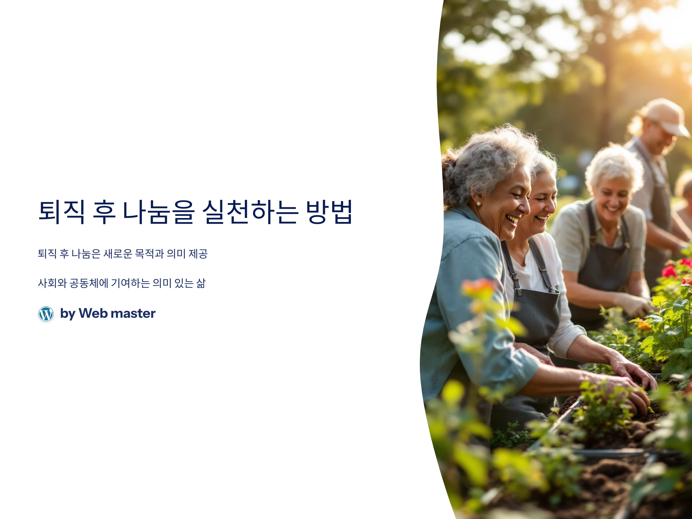 퇴직 후 나눔을 실천하는 방법은 무궁무진합니다. 자원봉사, 기부, 멘토링, 커뮤니티 활동, 환경 보호 등 다양한 방법으로 사회에 기여할 수 있습니다. 나누는 삶은 자기 자신에게도 긍정적인 영향을 미치며, 사회적 관계를 더욱 풍요롭고 의미 있게 만들어 줍니다. 퇴직 후 여유를 가지면서도 나누는 삶을 실천한다면, 더욱 만족스럽고 보람찬 삶을 살아갈 수 있을 것입니다. 작은 나눔이 큰 변화를 이끌어내며, 이를 통해 더 나은 세상을 만드는 데 기여할 수 있습니다.
