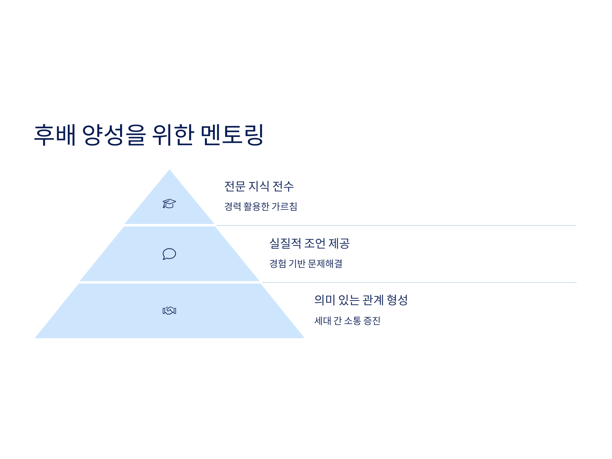 멘토링은 나의 경험을 통해 후배들에게 실질적인 도움이 되는 것을 넘어, 자신에게도 다시 한 번 학습과 성찰의 기회를 제공하는 활동입니다. 이를 통해 사회에 긍정적인 영향을 미치는 것뿐만 아니라, 퇴직 후에도 지속적인 학습과 성장을 할 수 있습니다.