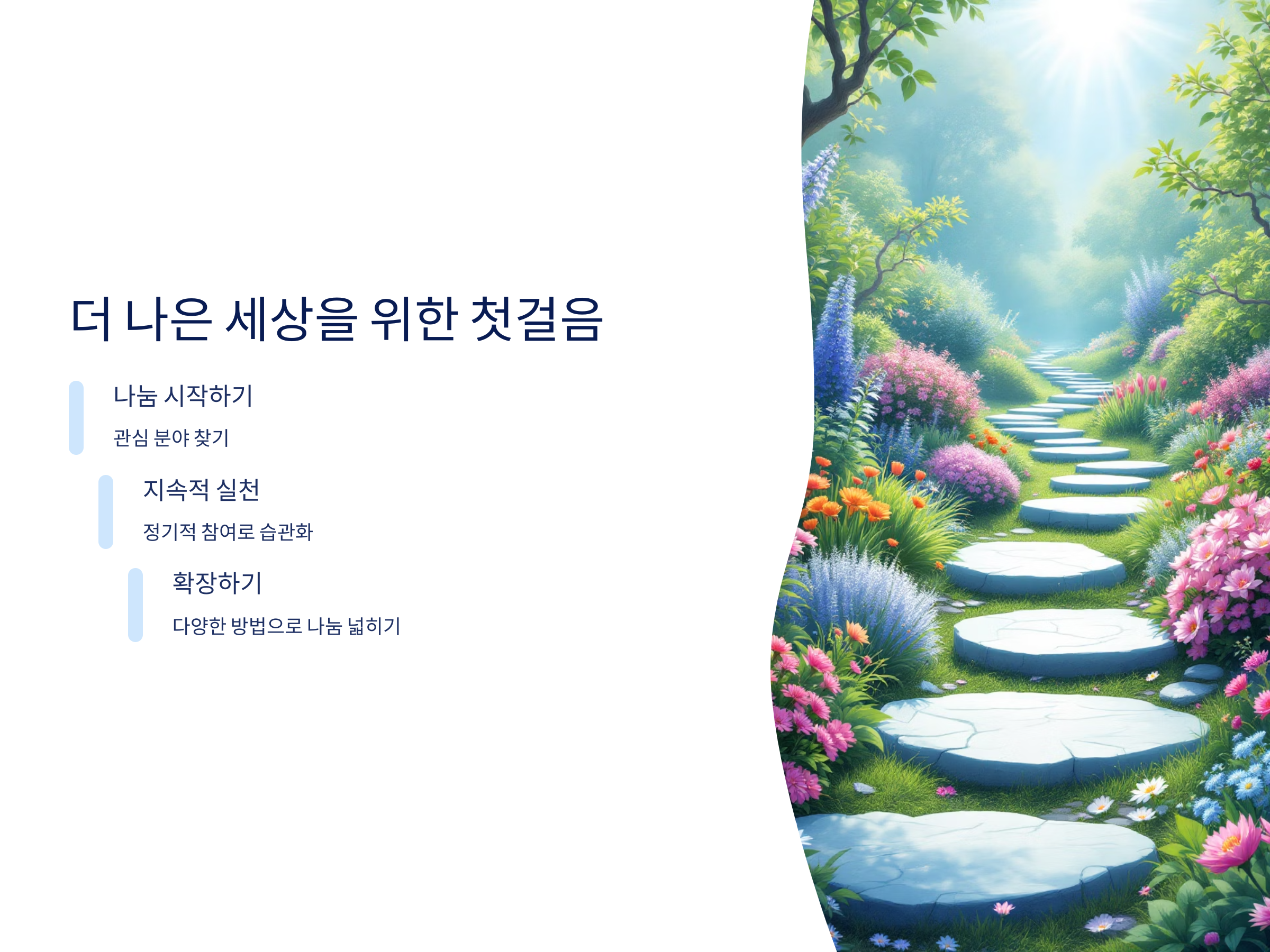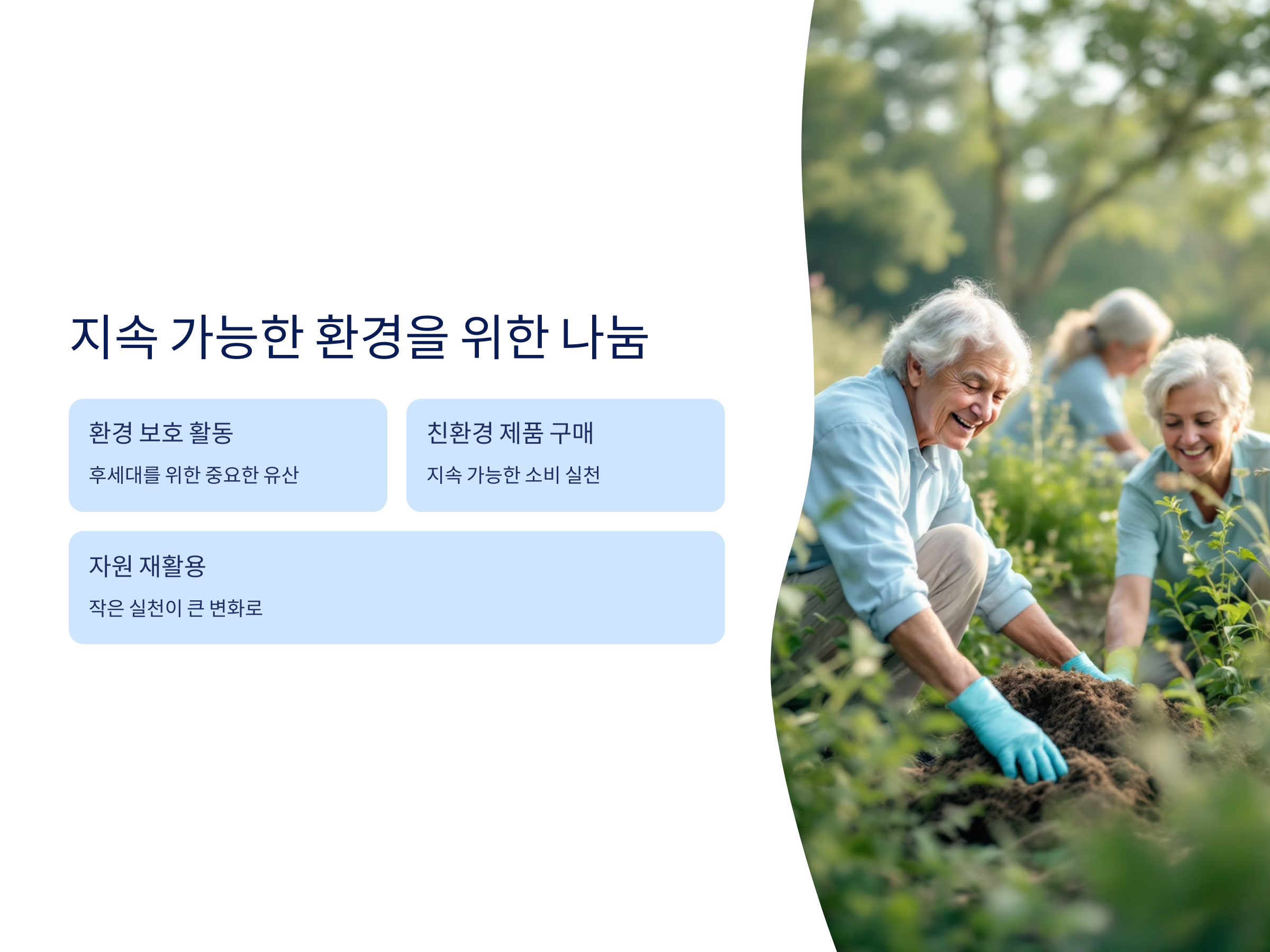 환경 보호와 지속 가능한 발전은 우리가 후배들에게 물려줄 가장 중요한 유산 중 하나입니다. 퇴직 후에는 환경 보호 활동에 참여하거나, 친환경 제품을 구매하며, 지속 가능한 삶을 실천하는 방법도 있습니다. 예를 들어, 자원 재활용을 실천하고, 재사용 가능한 제품을 구매하며, 지역 내 환경 보호 단체와 협력하는 것 또한 큰 나눔이 될 수 있습니다.