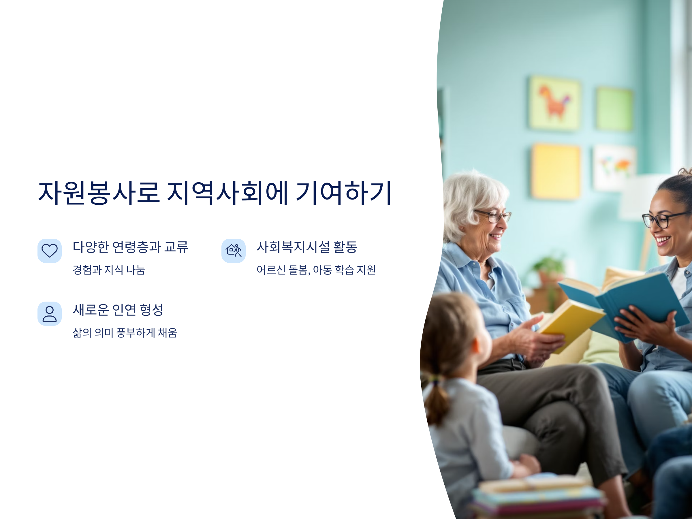 퇴직 후 자원봉사는 나눔을 실천하는 가장 대표적인 방법입니다. 지역사회에서 자원봉사 활동에 참여하면, 다양한 연령대의 사람들과 교류하고, 자신의 경험과 지식을 나눌 수 있습니다. 예를 들어, 사회복지시설에서 어르신들과 시간을 보내거나, 아동복지기관에서 아이들에게 학습 지원을 할 수 있습니다. 자원봉사는 단순히 시간을 보내는 것 이상의 의미를 가지며, 사람들에게 실질적인 도움을 주고, 나 자신에게도 큰 보람을 안겨줍니다.